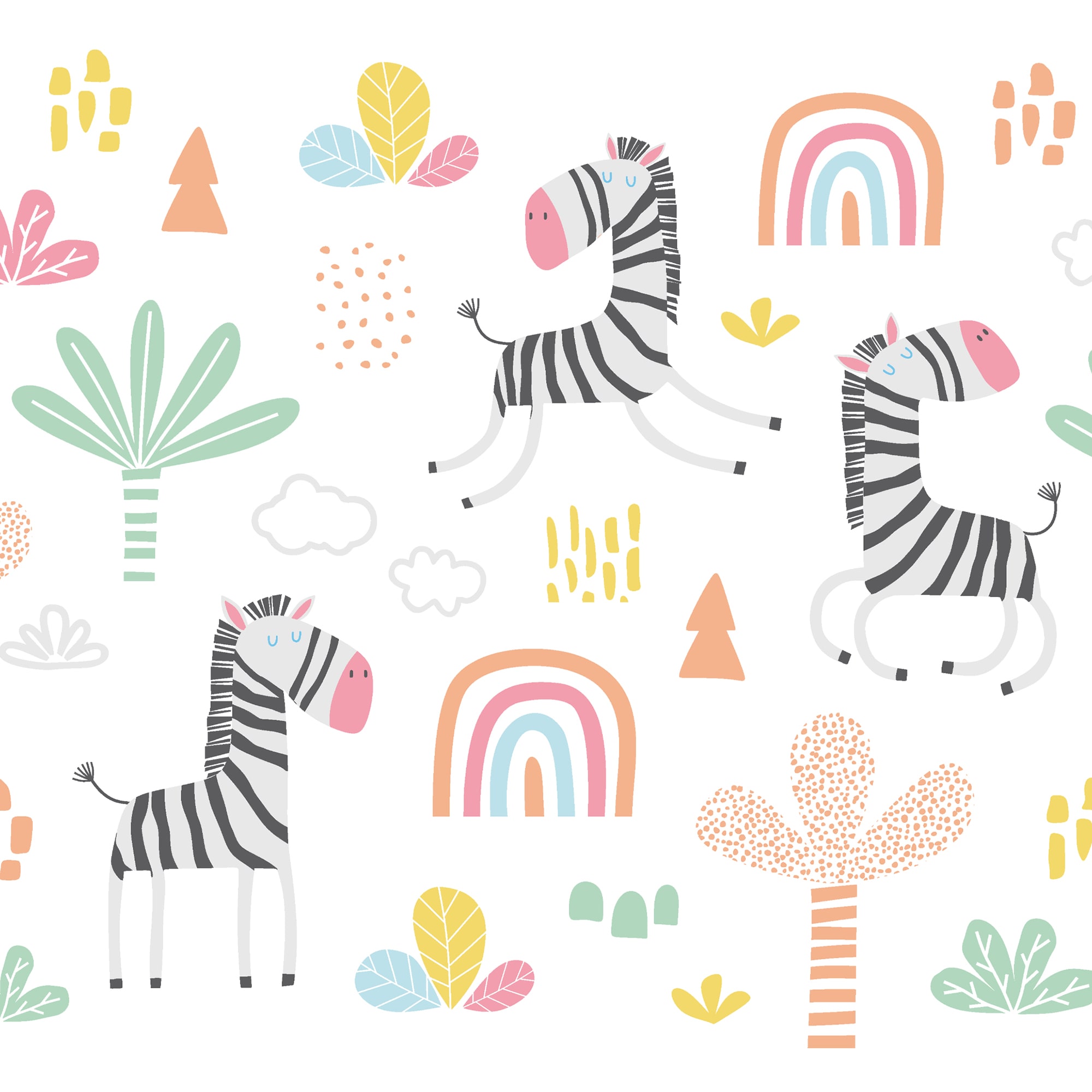 Prancing zebras show off their sass in this funky, children’s wall mural. Decorative illustrations of palm trees, rainbows, clouds and leaves add a playful dimension to the design.