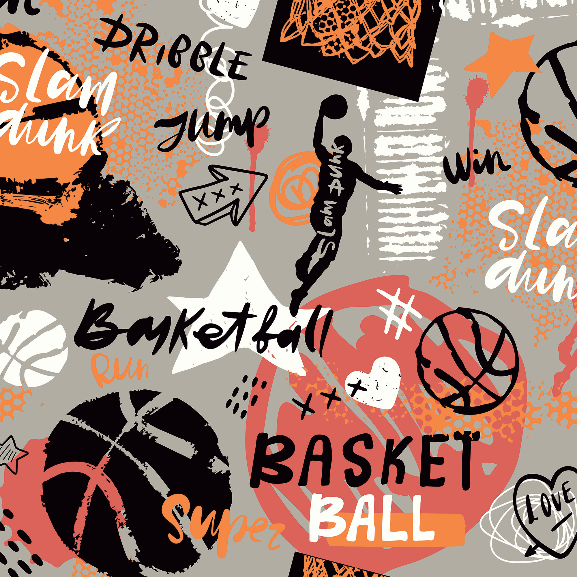 Urban and full of character, this design features graffiti style basketball-themed illustrations and writing. The layering of the doodles creates a sense of dimension and dynamicity, an inspiring mural for any basketball fan.
