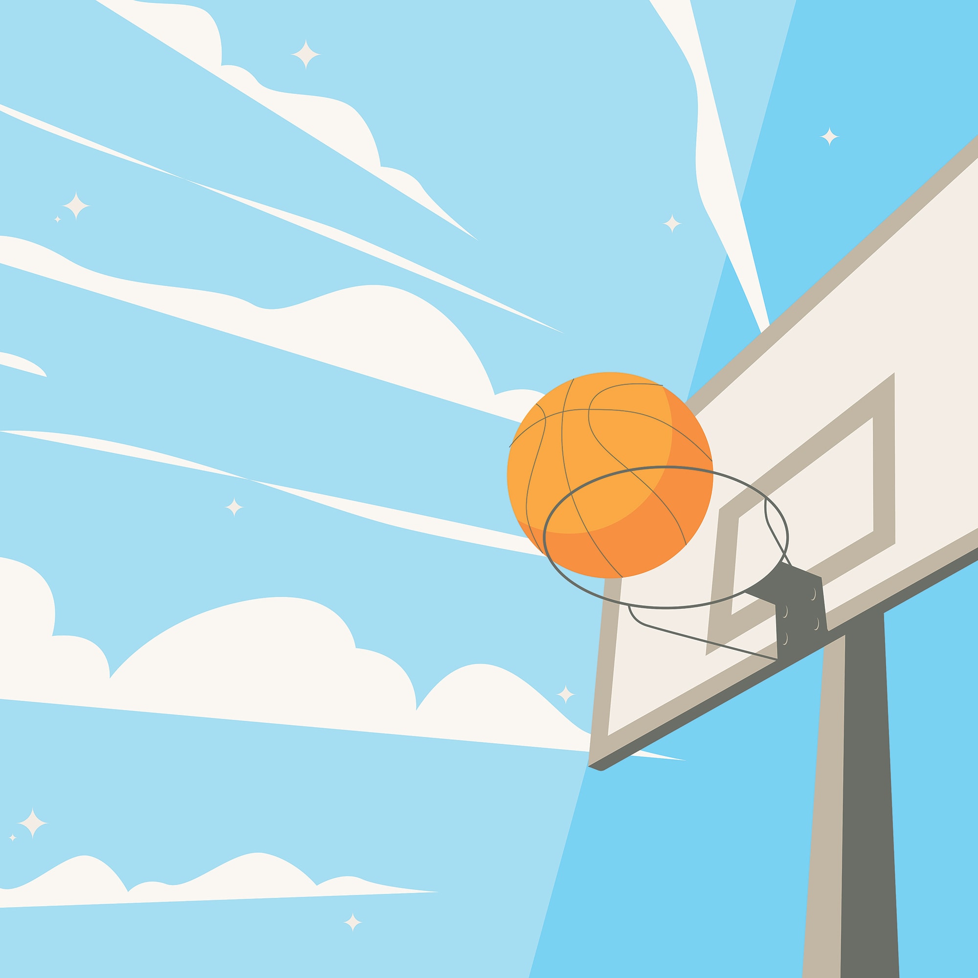 A clear sky with a few illustrative clouds sit in the background of this sporty mural, featuring a basketball about to fall through the hoop of the net. The graphic style of illustration makes this mural simple yet striking.