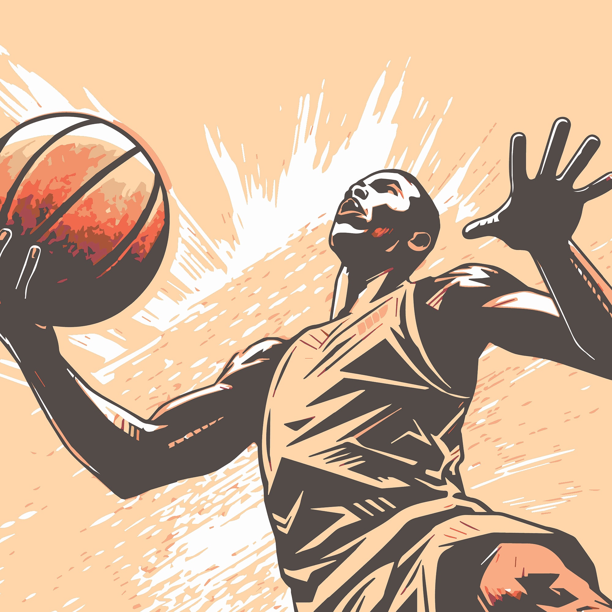 Striking and dynamic, this mural depicts a basketball player taking the final jump before scoring. Against a plain ground, the graphic illustration of the player is bold and captivating.