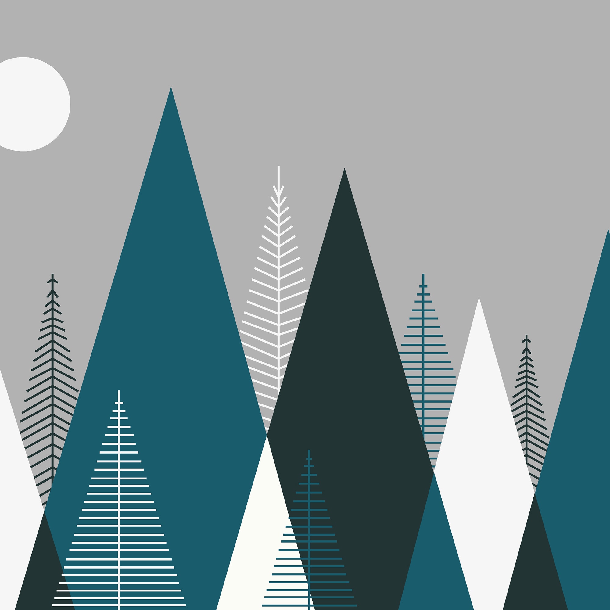 Clean and contemporary, sharp geometric lines combine to form the shapes of mountains and fir trees in this Scandinavian-inspired graphic Mountainscape. Minimalistic yet bold at the same time.
