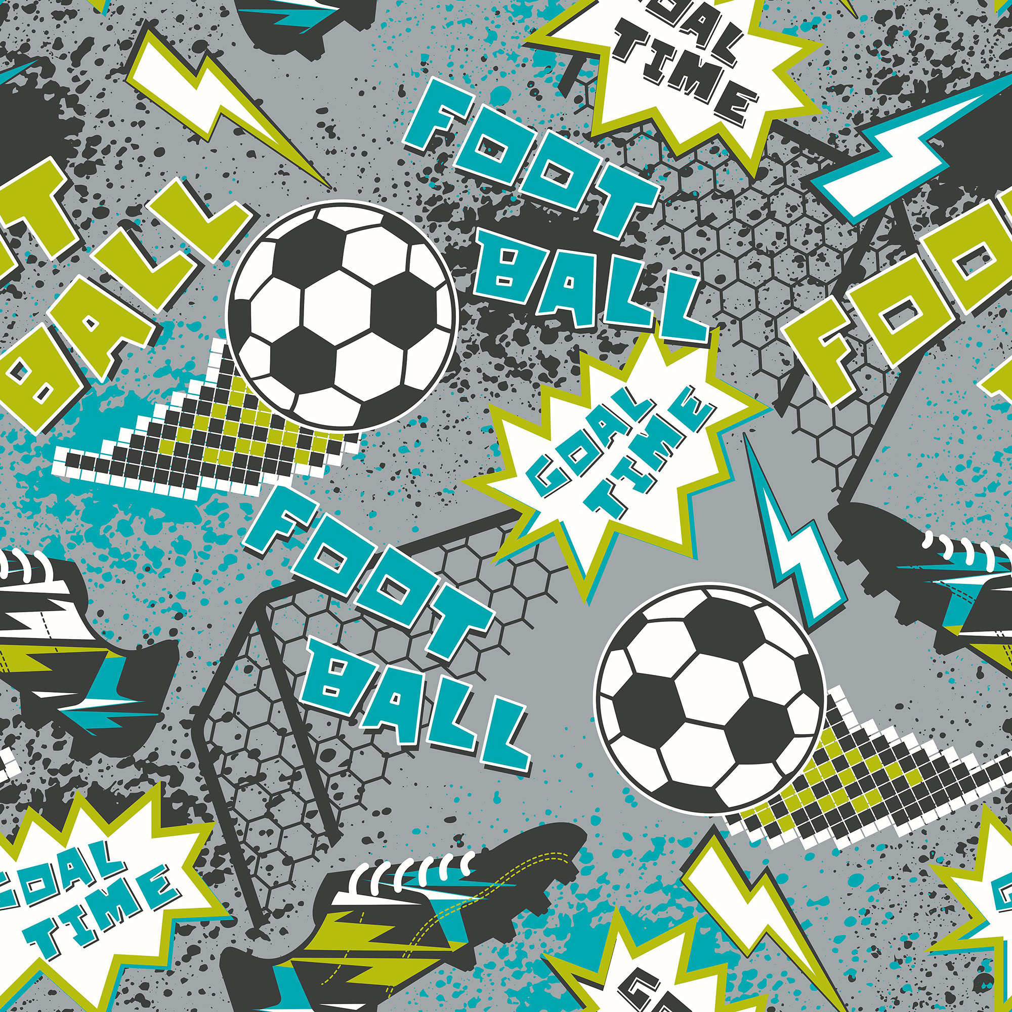 This graphic mural features bold doodles of footballs, football boots and goal nets, with lightning bolts and football phrases dotted around the design. Dynamic and striking, this is the perfect mural for any football fan.