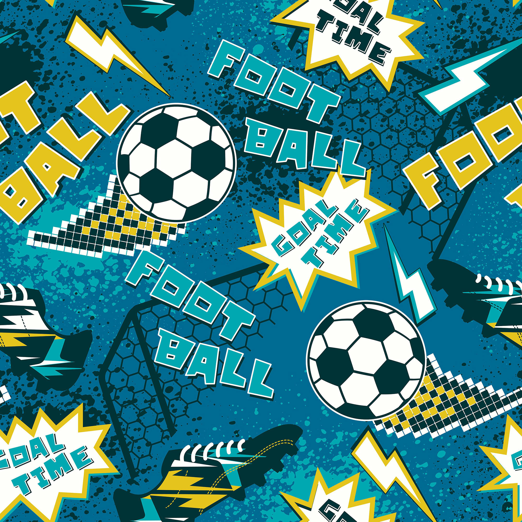 This graphic mural features bold doodles of footballs, football boots and goal nets, with lightning bolts and football phrases dotted around the design. Dynamic and striking, this is the perfect mural for any football fan.