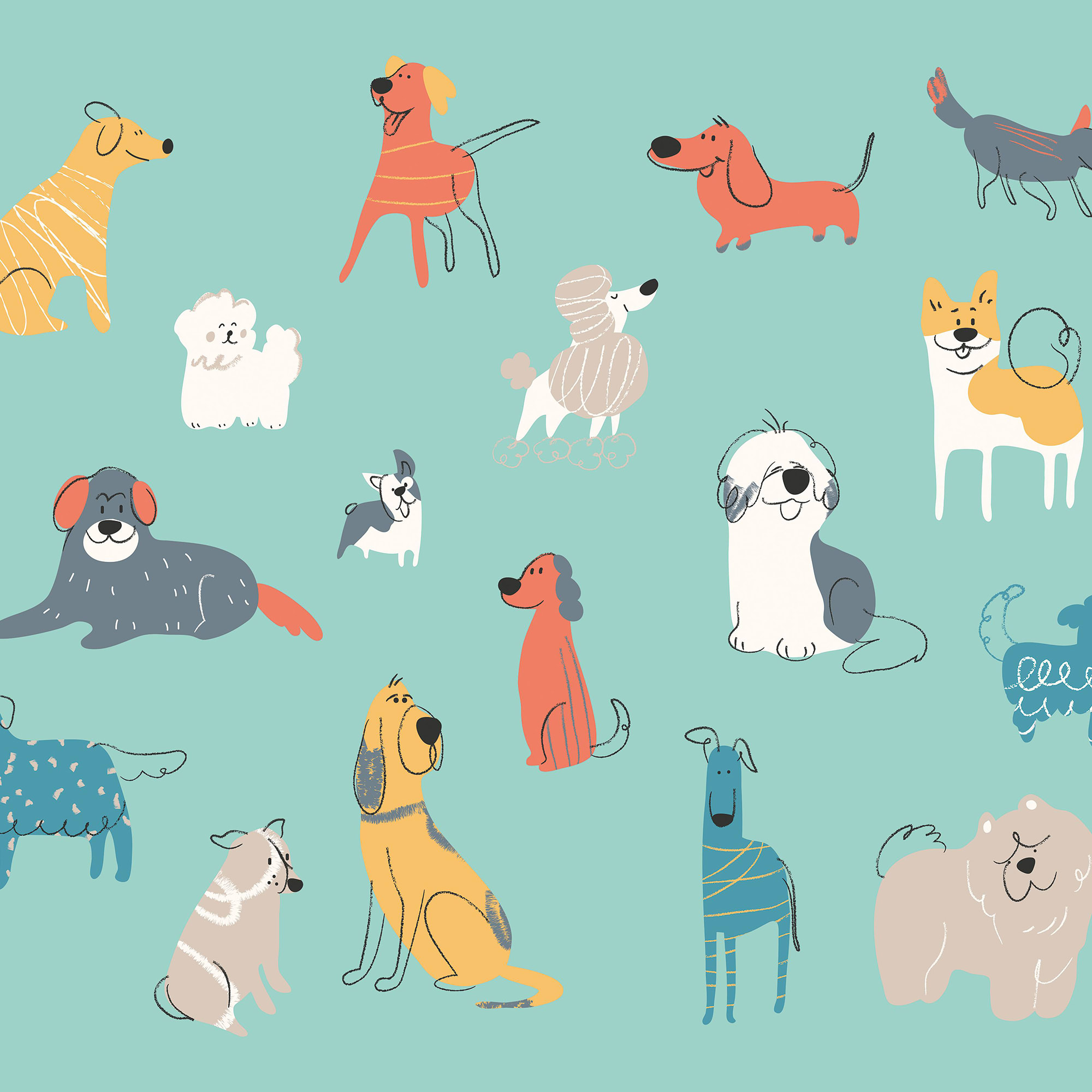 Positive, playful and downright charming, the Happy Dogs mural features a simple design of cartoon, doodled dogs of different breeds against a single-coloured ground. Happy and energetic, this mural is bound to introduce a sense of spirit to your space.