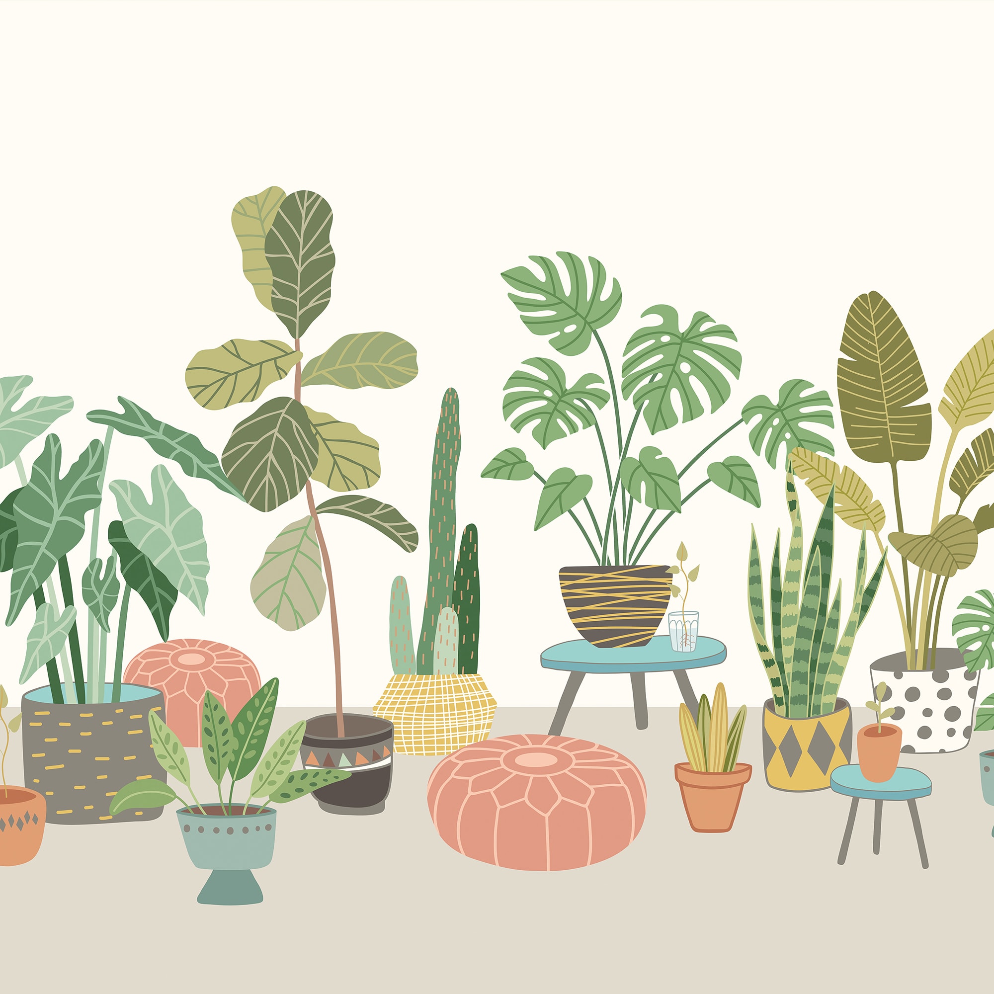 The Houseplant Pots Wall Mural from Origin Murals depicts houseplants of all shapes and sizes in decorative ceramic pots and perched on small tables. Large leaves on tall stems reach skyward, whilst smaller cacti and more dainty greenery sit at the foreground of the scene alongside pouf cushions.