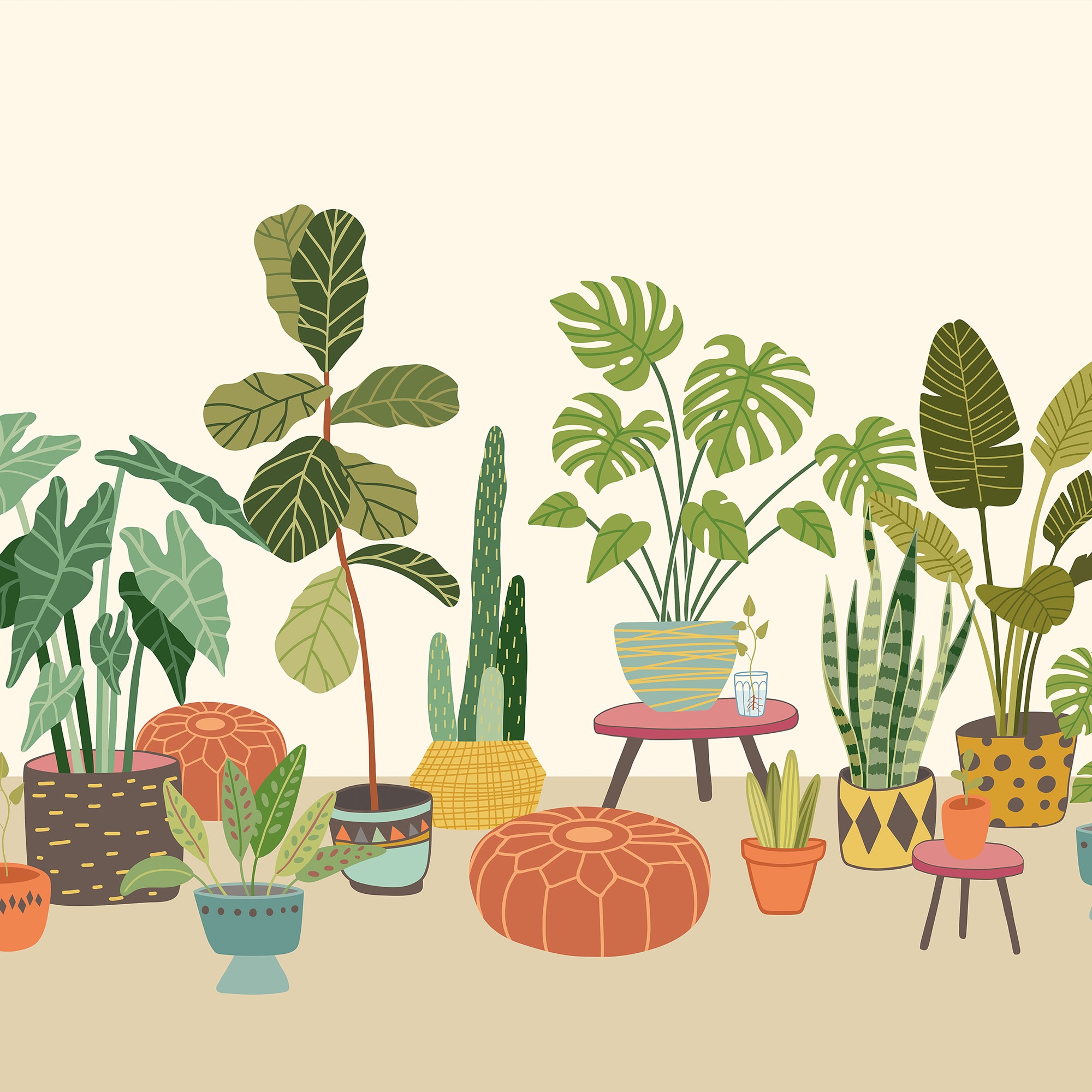 The Houseplant Pots Wall Mural from Origin Murals depicts houseplants of all shapes and sizes in decorative ceramic pots and perched on small tables. Large leaves on tall stems reach skyward, whilst smaller cacti and more dainty greenery sit at the foreground of the scene alongside pouf cushions.