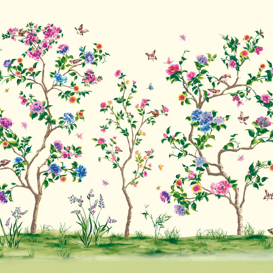 This beautifully hand-drawn chinoiserie wall mural features an array of watercolour flowers, trees, birds and butterflies sat on a rolling landscape ground. If you’re looking for a design to bring some botanical garden serenity into your home, this wall mural is the perfect choice.