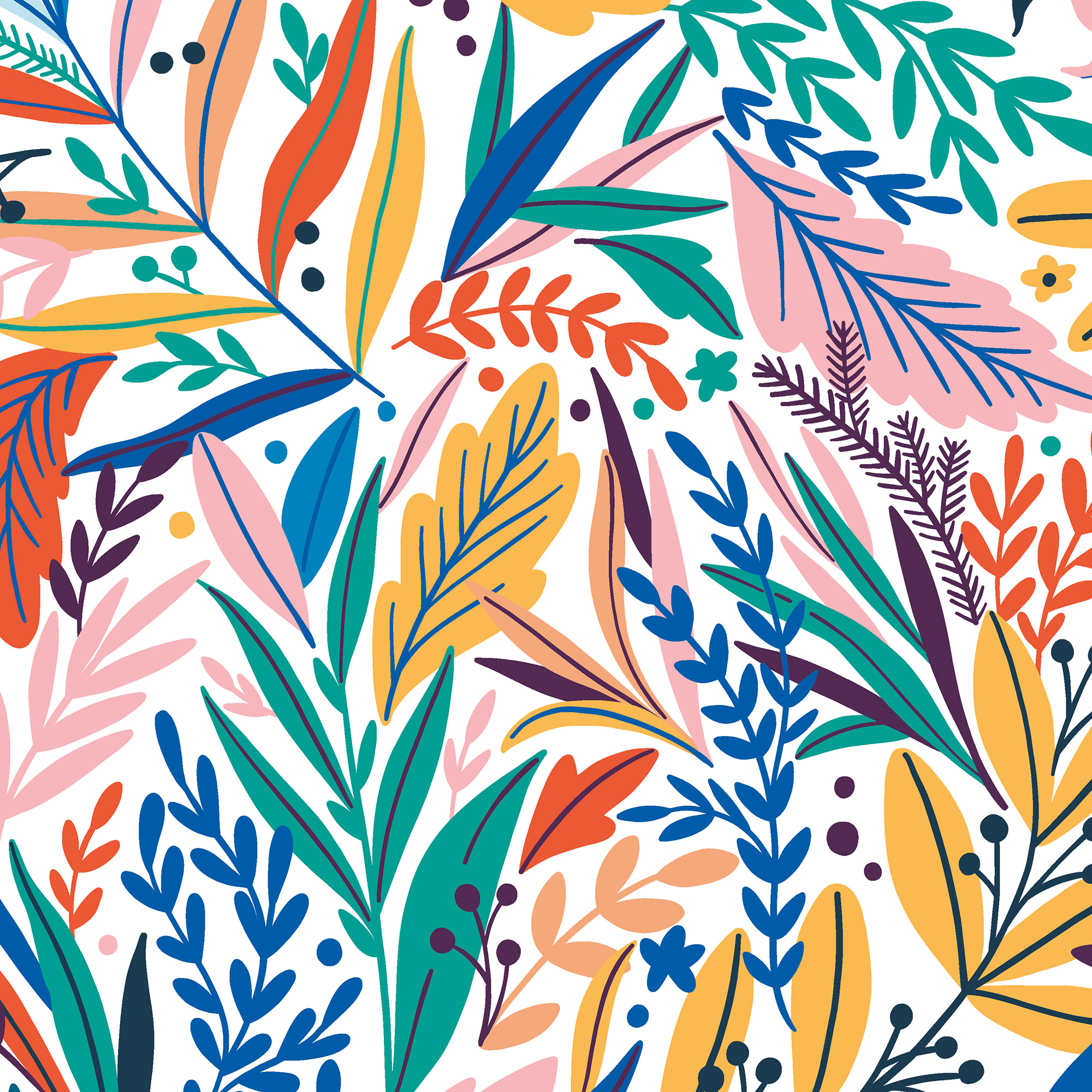 An array of illustrative leaves, stems and graphic foliage overlap and intertwine in this simple yet contemporary mural. The multi-directional nature of the design creates liveliness with deviating dots and little petals adding spirit and movement.