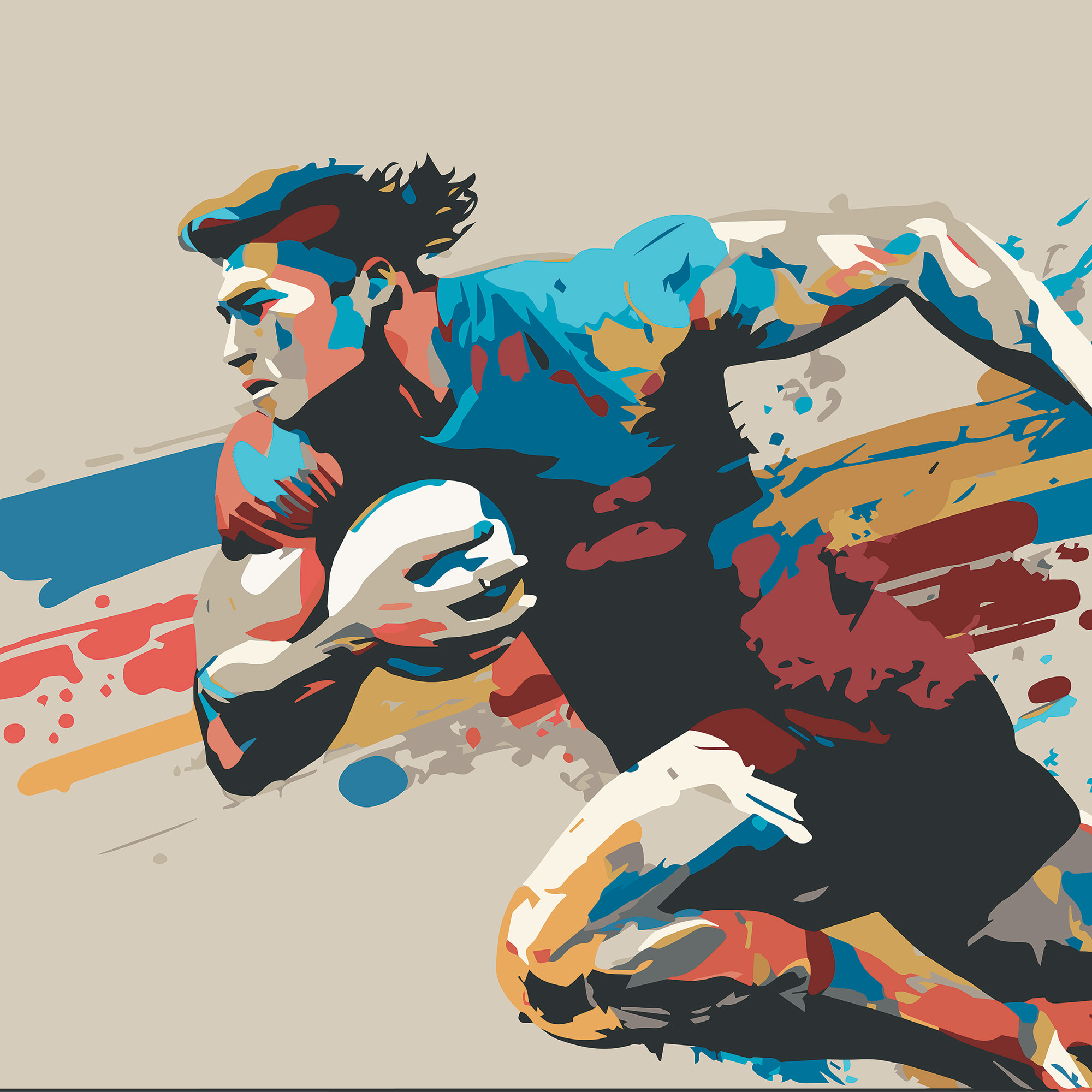 This dynamic design features a rugby player running with the ball, with organic strokes of colour indicating just how fast they're running and creating a sense of life and movement.