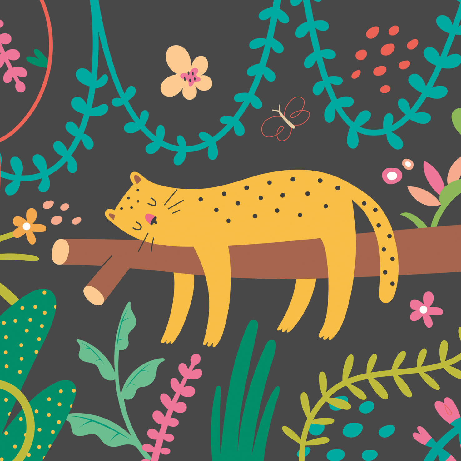 In this children’s wall mural, a sleepy leopard takes an afternoon snooze amongst the vines, flowers and leaves of his jungle home.