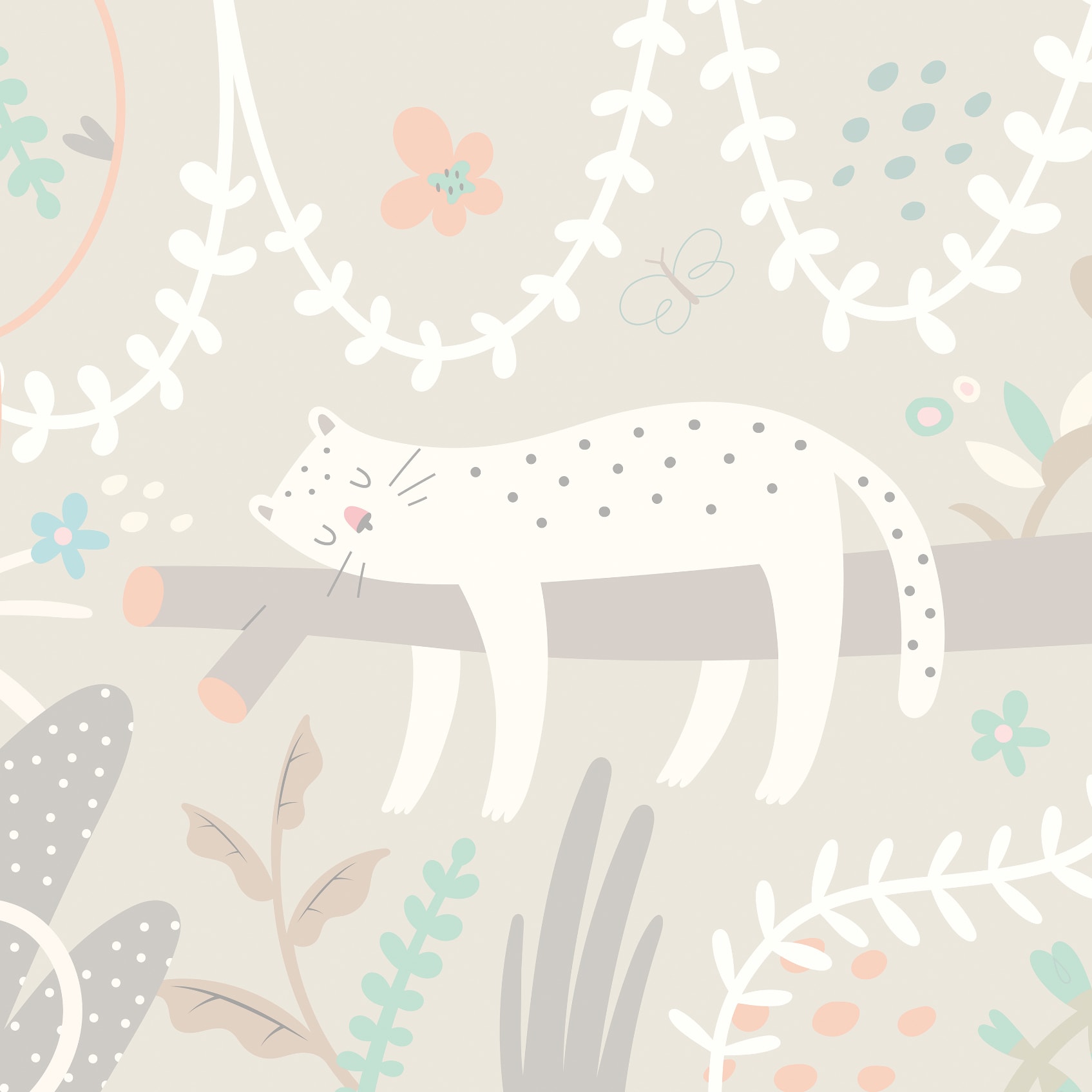 In this children’s wall mural, a sleepy leopard takes an afternoon snooze amongst the vines, flowers and leaves of his jungle home.