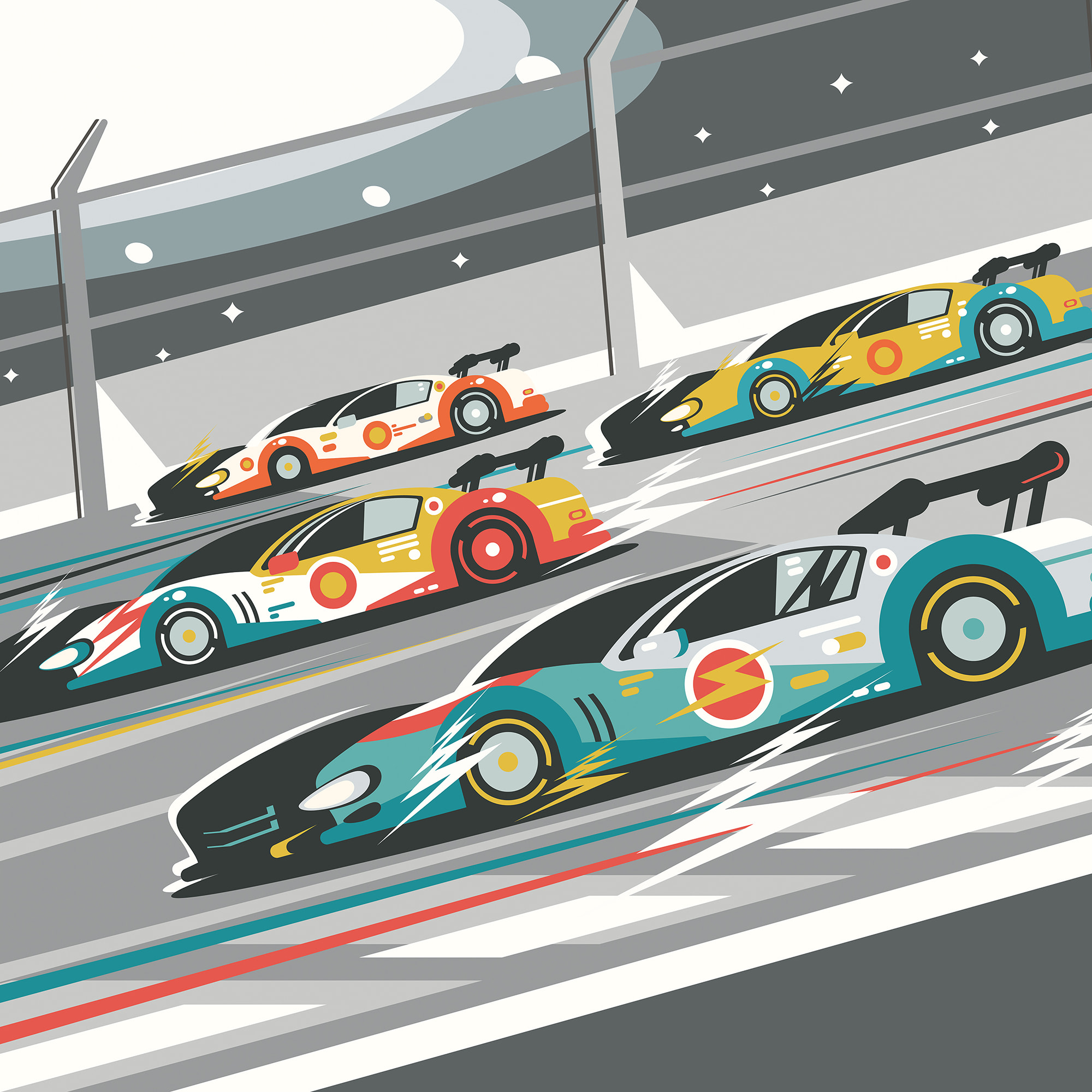 The Sports Cars Wall Mural from Origin Murals features sportscars of different colours racing around a track under a night sky dotted with stars. A sense of dynamicity and movement is created through speedy zigzag symbols around the cars, showing just how fast they’re going.