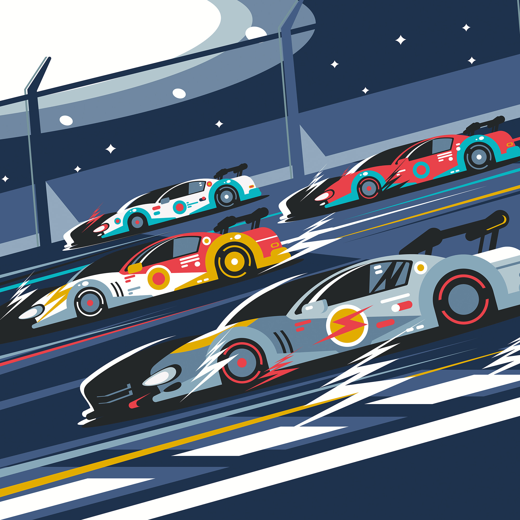 The Sports Cars Wall Mural from Origin Murals features sportscars of different colours racing around a track under a night sky dotted with stars. A sense of dynamicity and movement is created through speedy zigzag symbols around the cars, showing just how fast they’re going.
