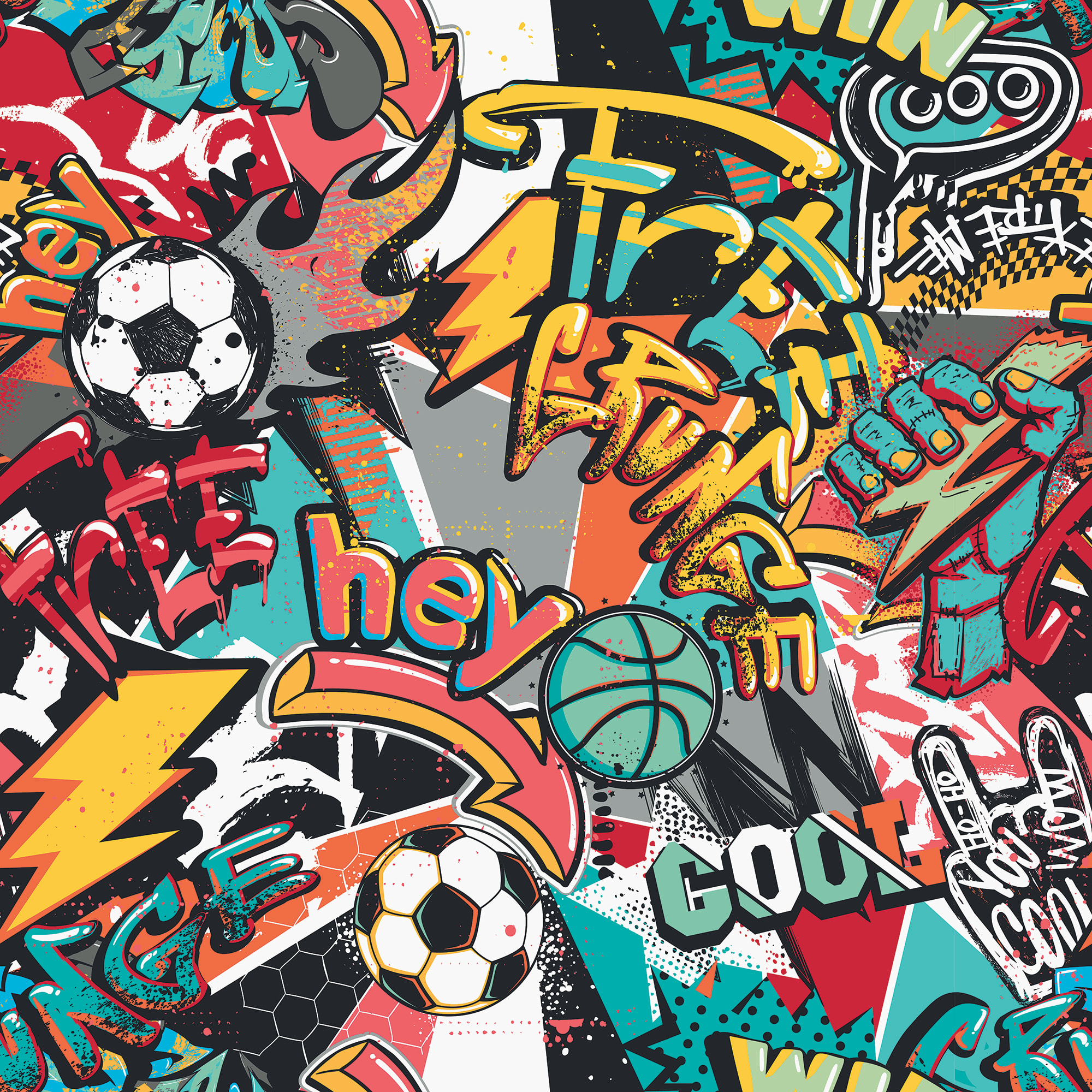 Loud and proud, this design features bold doodles of footballs, basketballs, lightning bolts and catchphrases. Make a sporty statement with this confident mural.