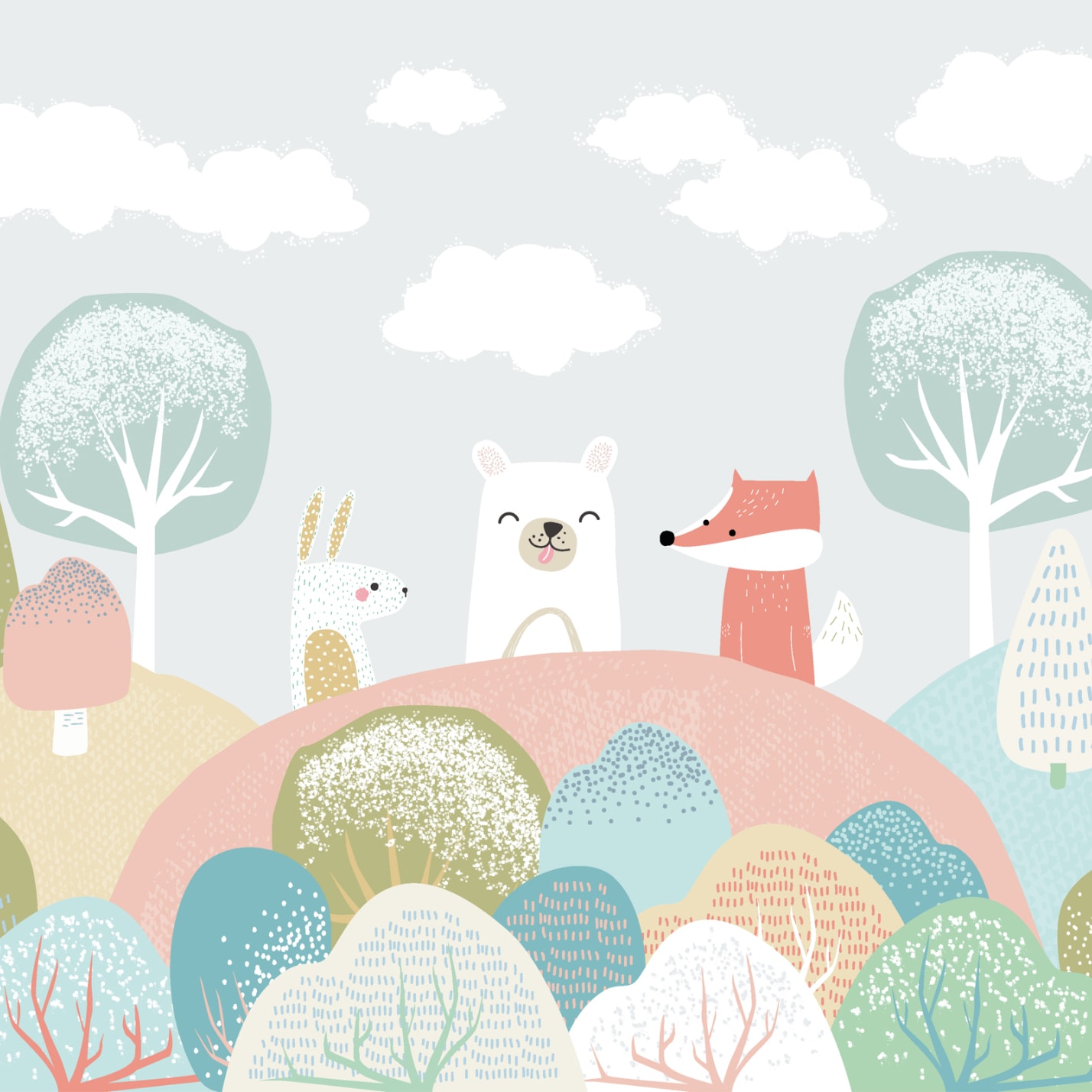 Add whimsical charm to your children’s bedroom with this wall mural. A rabbit, bear and fox sit in a woodland forest, surrounded by patterned trees and shrubs.