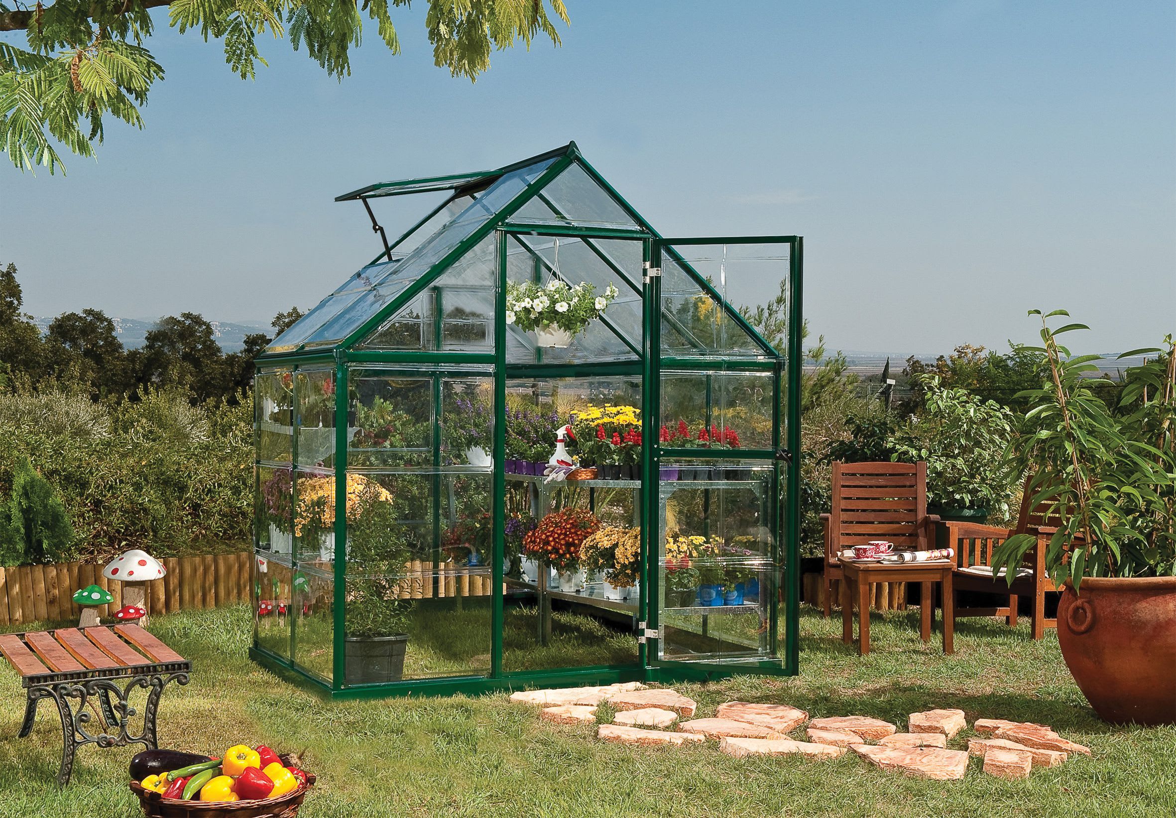 The Harmony greenhouses are maintenance-free, comprising a rust-resistant aluminium frame and crystal clear, virtually unbreakable glass-like polycarbonate panels, which provide extra durability for many seasons to come. It is a perfect environment for your flowers and plants.