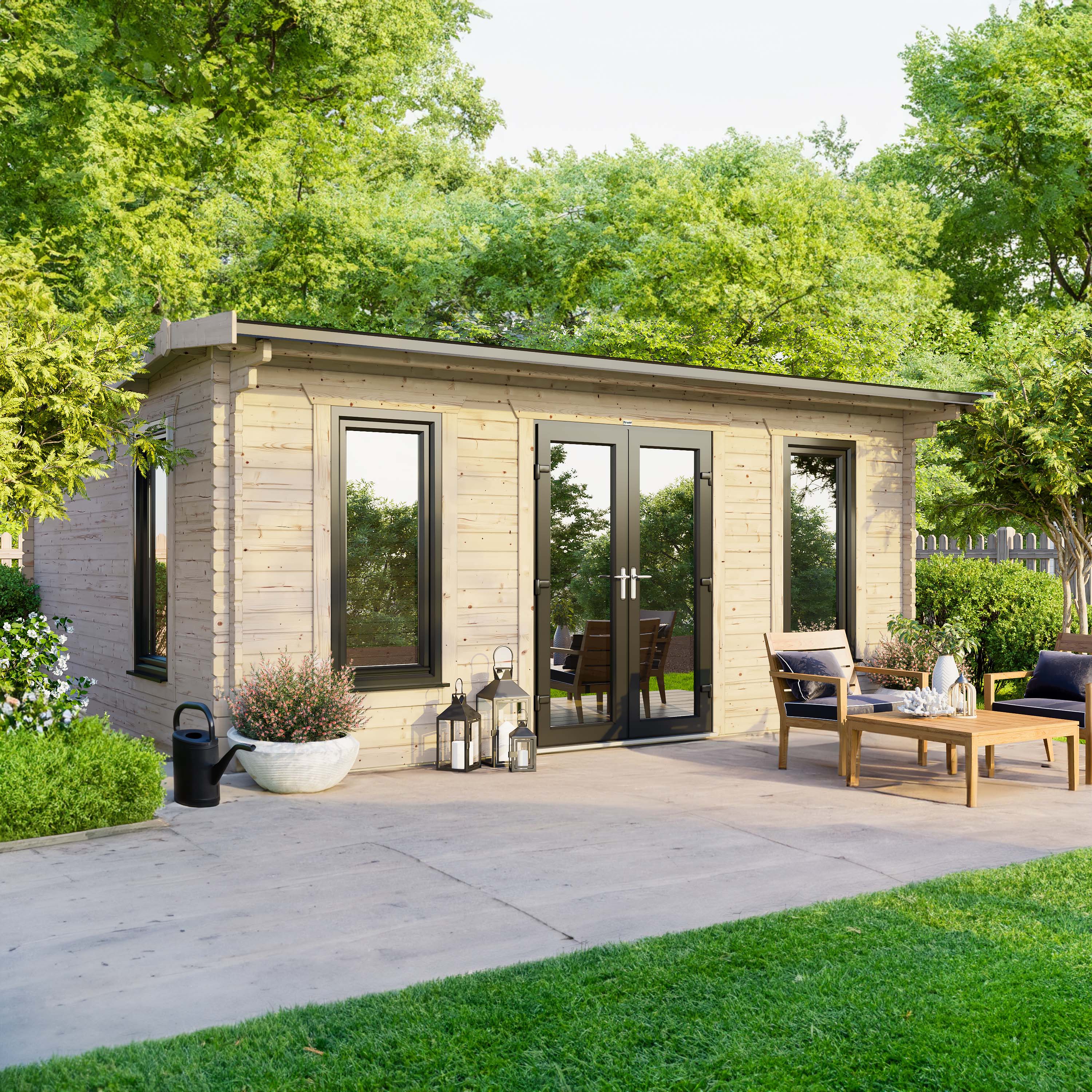 The Powersheds Central Doors Apex Notched Logs Log Cabin comes complete with uPVC double doors in anthracite grey and uPVC 'tilt and turn' opening Windows. All glass is both toughened and double glazed, perfect for extra security and insulation. This cabin has many great design features such as high grade tongue and groove floors and roofs, innovative rubber roofing system, and external sills on all windows.