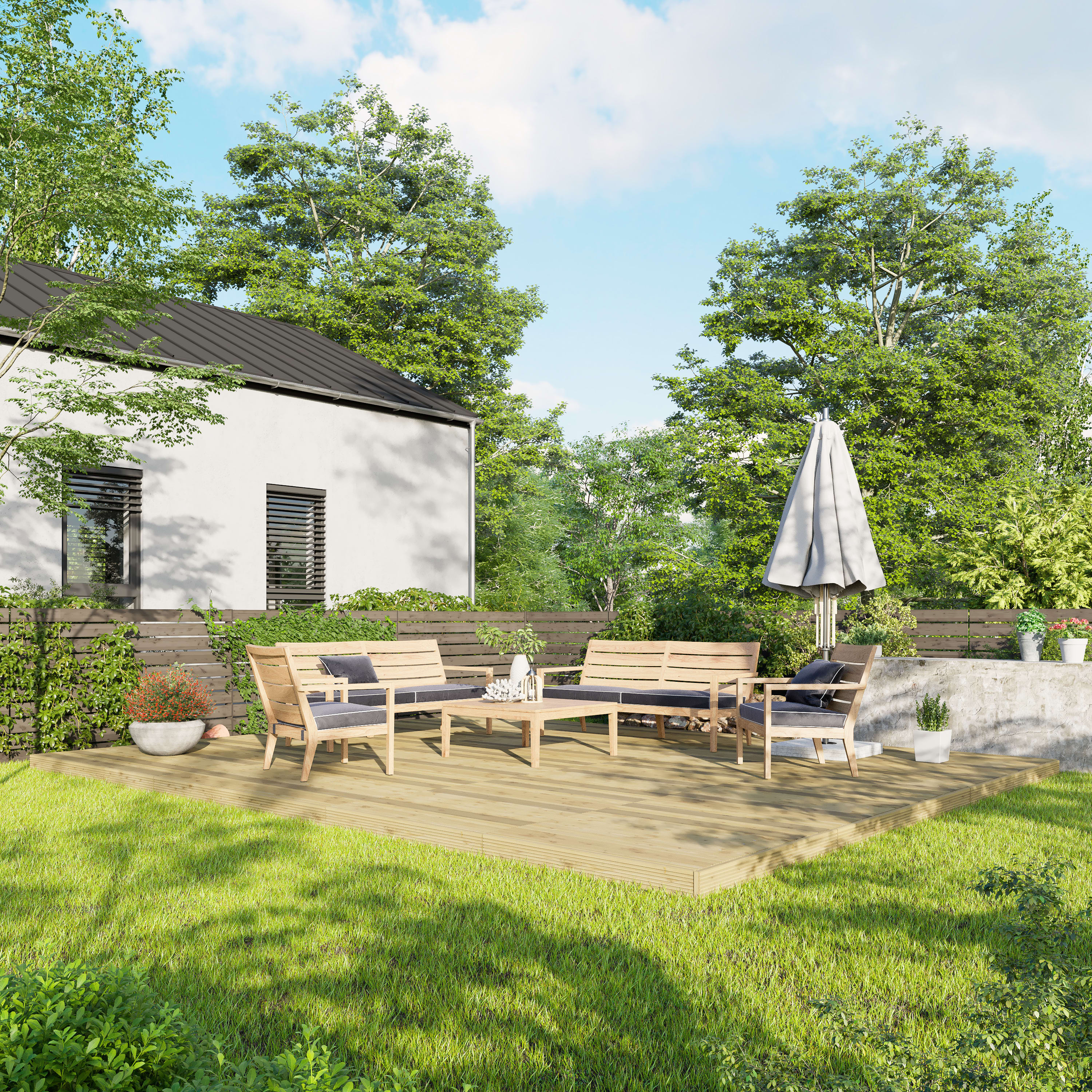 - 95mm x 44mm Tanalised Base Rails – The decking base arrives in modular sections, pre-assembled for further installation ease. The base is pressure treated giving the decking kit a good foundation and ensuring longevity, weather resistance and anti-rot protection.