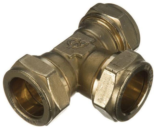 - Equal tee compression fittings used to join three of the same 28mm pipes together in a T-shape