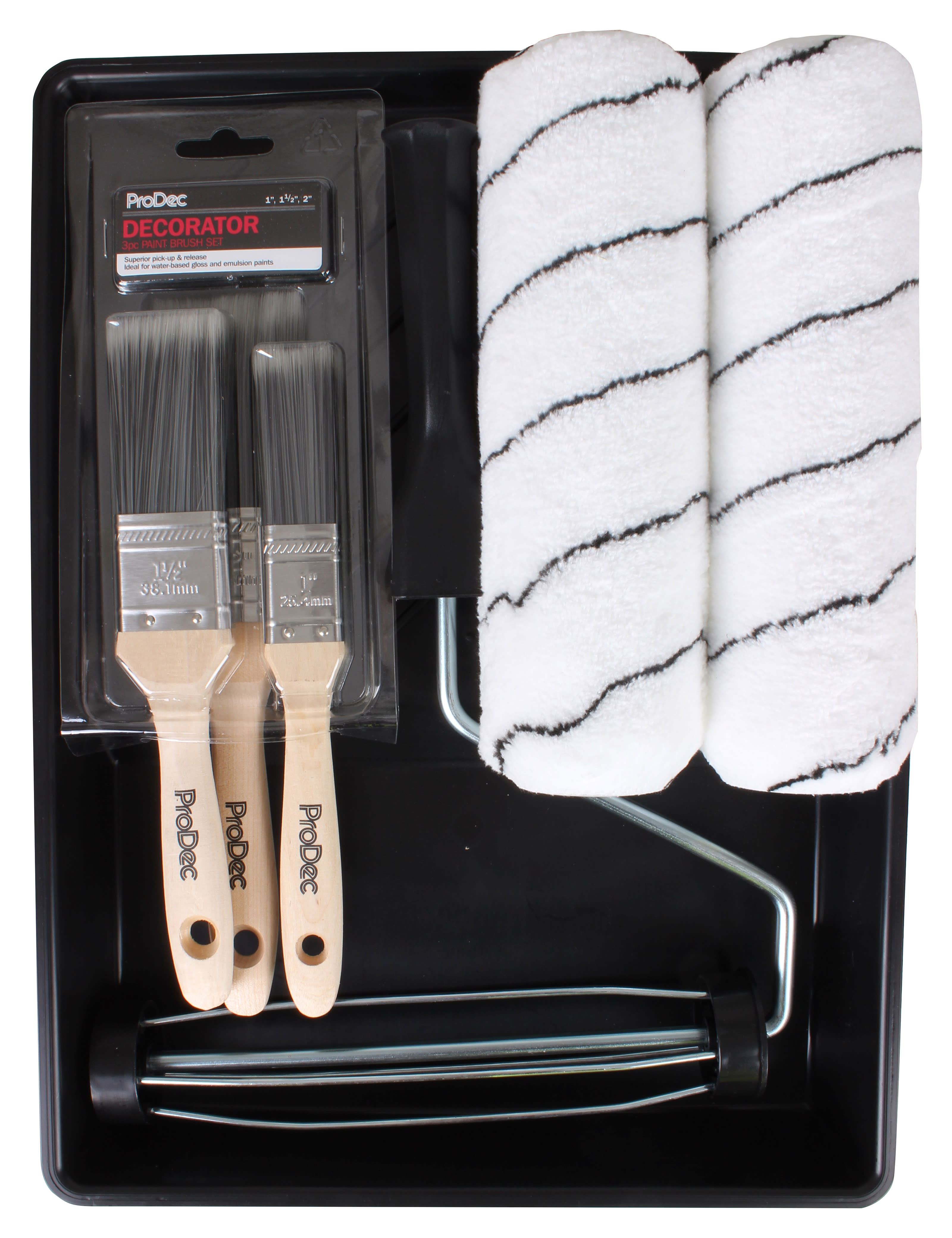 • Includes: 9” ProDec advance soft grip frame, 9” plastic tray, 2 x ProDec advance microfibre sleeves and 1 x 1", 1 x 1.5", 1 x 2" synthetic paint brushes