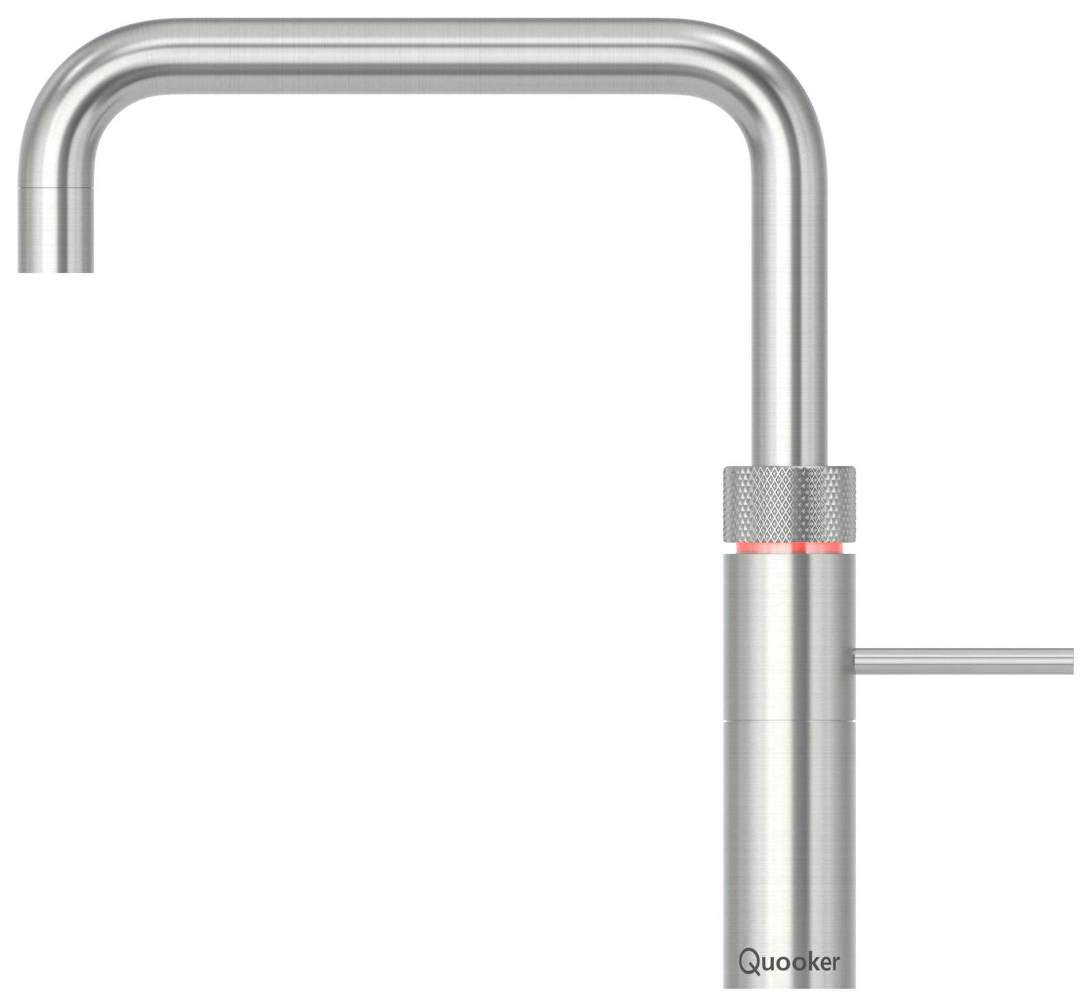 Quooker Fusion 3-in-1 Square Neck Kitchen Tap dispenses hot, cold and 100°C boiling water all from a single, elegant, insulated square spout. This stunning tap is finished in stainless steel and has a childproof handle. Featuring a red light ring that illuminates around the handle to indicate when the boiling water is in use.