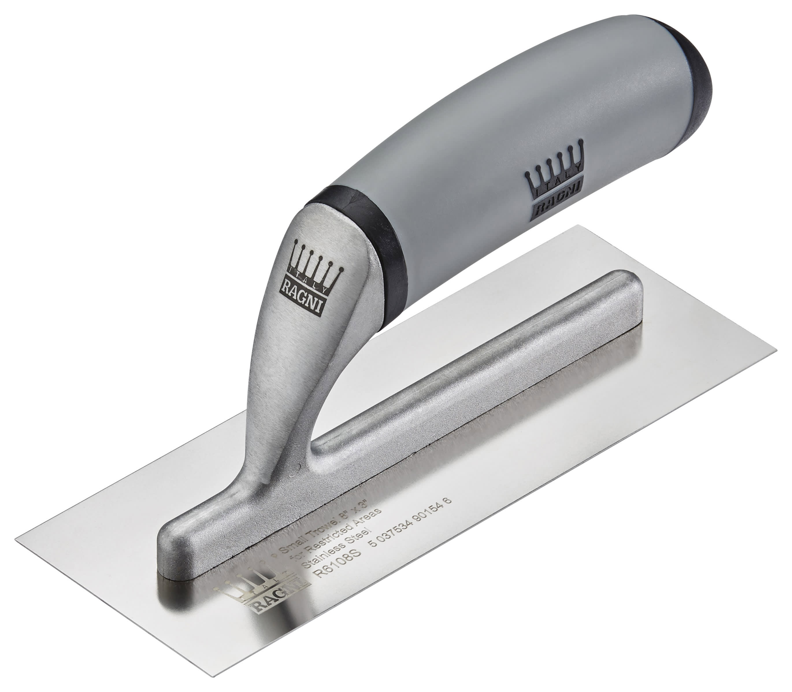 Ragni R6108S Small Trowel features an 8” Japanese stainless-steel blade that's securely attached to an aluminium stem and two-component soft-grip handle using hidden rivets, guaranteed for life. The handle is designed not to protrude past the blade's edge, making it perfect for working in tight areas. This trowel is laser engraved (no stickers), and its swept-back handle design provides excellent knuckle clearance. It's supplied with reusable blade edge protectors as standard.