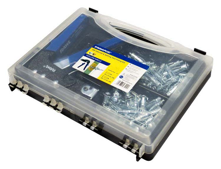 The Rawlplug SM Interset Cavity Fixing and Setting Tool Case are zinc-plated metal fixings with metric screws. Suitable for board building materials with a thickness 2-38mm and allows for a number of different applications. Large contact area of expanded arms increases load-bearing capacity and security.Internal anti-rotation lugs and combi-head screw supplied. Professional setting tool included.