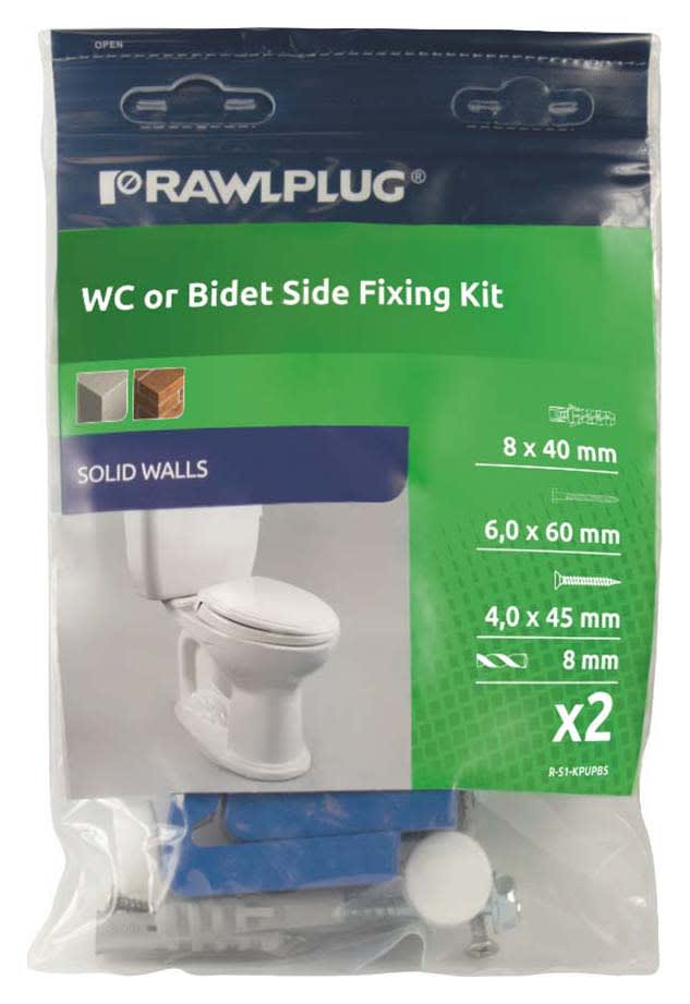 The Rawlplug KPUPS WC/SIDE Fixing Set Kit is designed for fixing WC pans and bidets with a side-fixing hole. Easy-to-install WC fixings that give exceptional performance in solid base materials. Nylon bushes are supplied to protect the ceramic when tightening the screws.