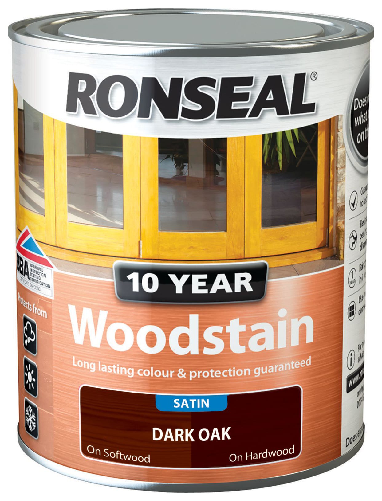 The Ronseal 10 Year Woodstain in the shade Dark Oak offers the best protection against the weather, leaving exterior wood looking great for 10 years. Easy to apply, it doesnt require a basecoat or primer and is rainproof in just one hour. It won't flake or peel. Suitable for all smooth planed exterior wood. Not suitable for decking.