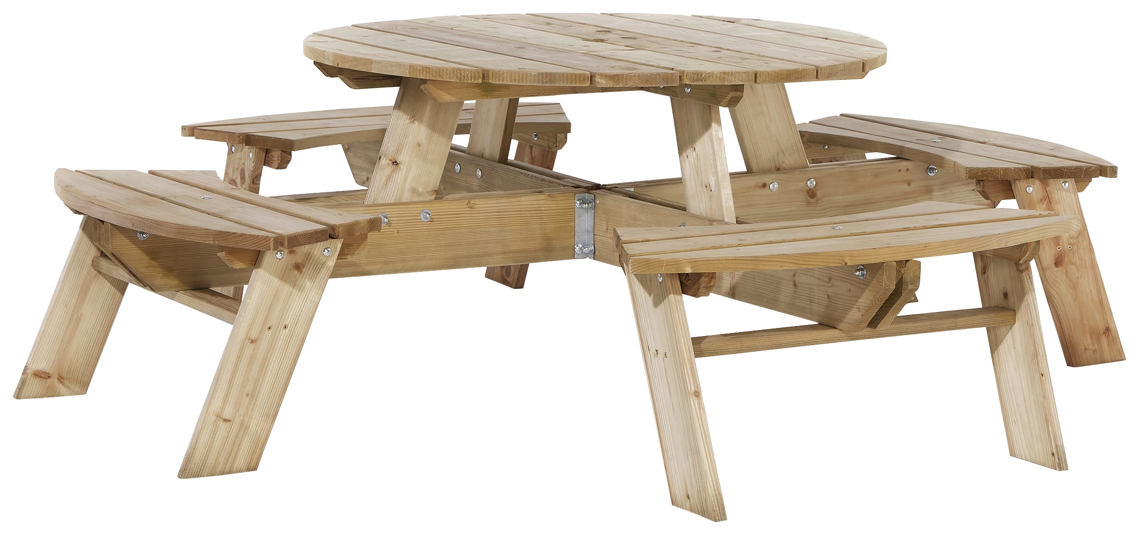 Classic round solid timber picnic table that will comfortably seat eight people. Wood has been pressure-treated against rot.