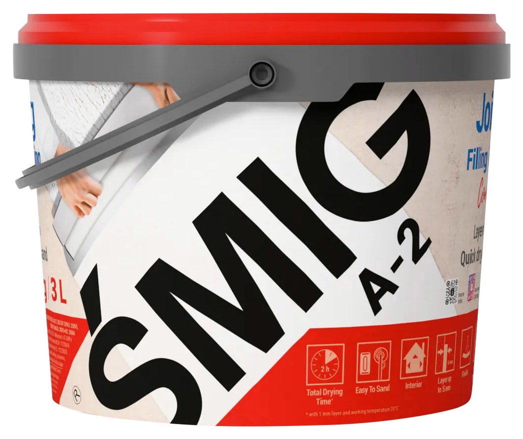 SMIG A2 Jointing Compound is a versatile, ready-mixed filler designed for effortless application on a wide range of surfaces, including wood, plasterboard, and previously painted walls. Perfect for jointing plasterboards, filling gaps, and achieving a smooth skim finish, it delivers a seamless, professional-quality result with minimal effort.