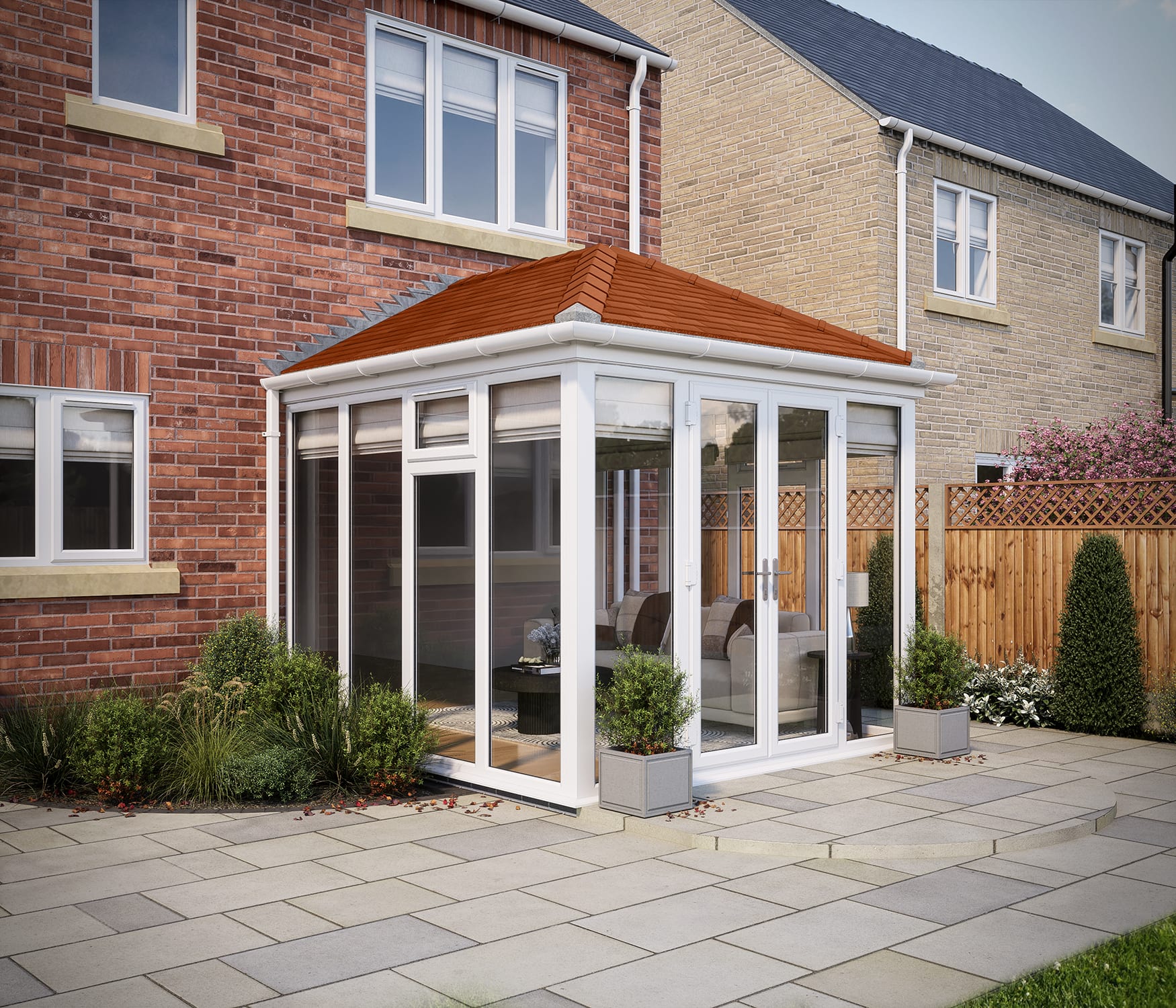 SOLid Roof Full Height Edwardian Conservatory with White Frame & Rustic Terracotta Tiles - 3 x 3m
