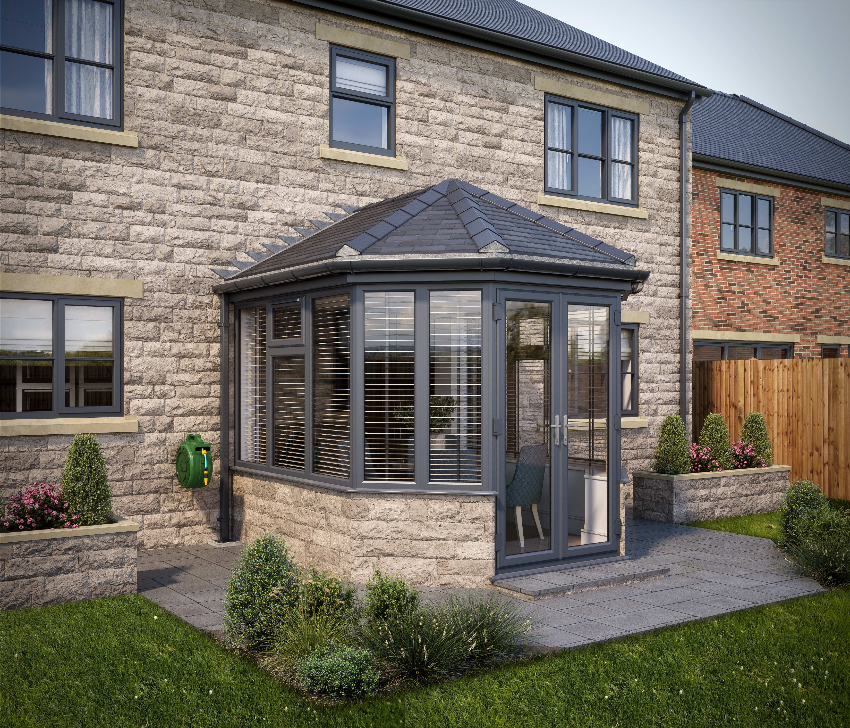 This SOLid Victorian Dwarf Wall Conservatory featuring grey frames, fascia and gutter, has a contemporary feel suitable for most modern homes. Using precision engineered parts, the structure is very easily installed and with warm roof technology, the SOLid roof conservatory will give you a comfortable living area all year round.