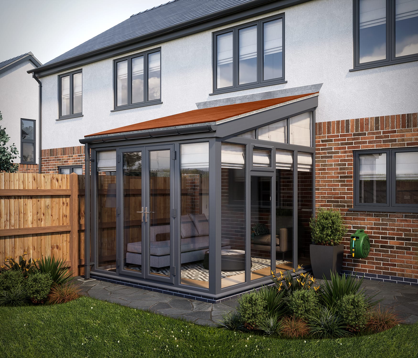 SOLid roof Full height Lean to Conservatory Grey Frames with Rustic Terracotta Tiles