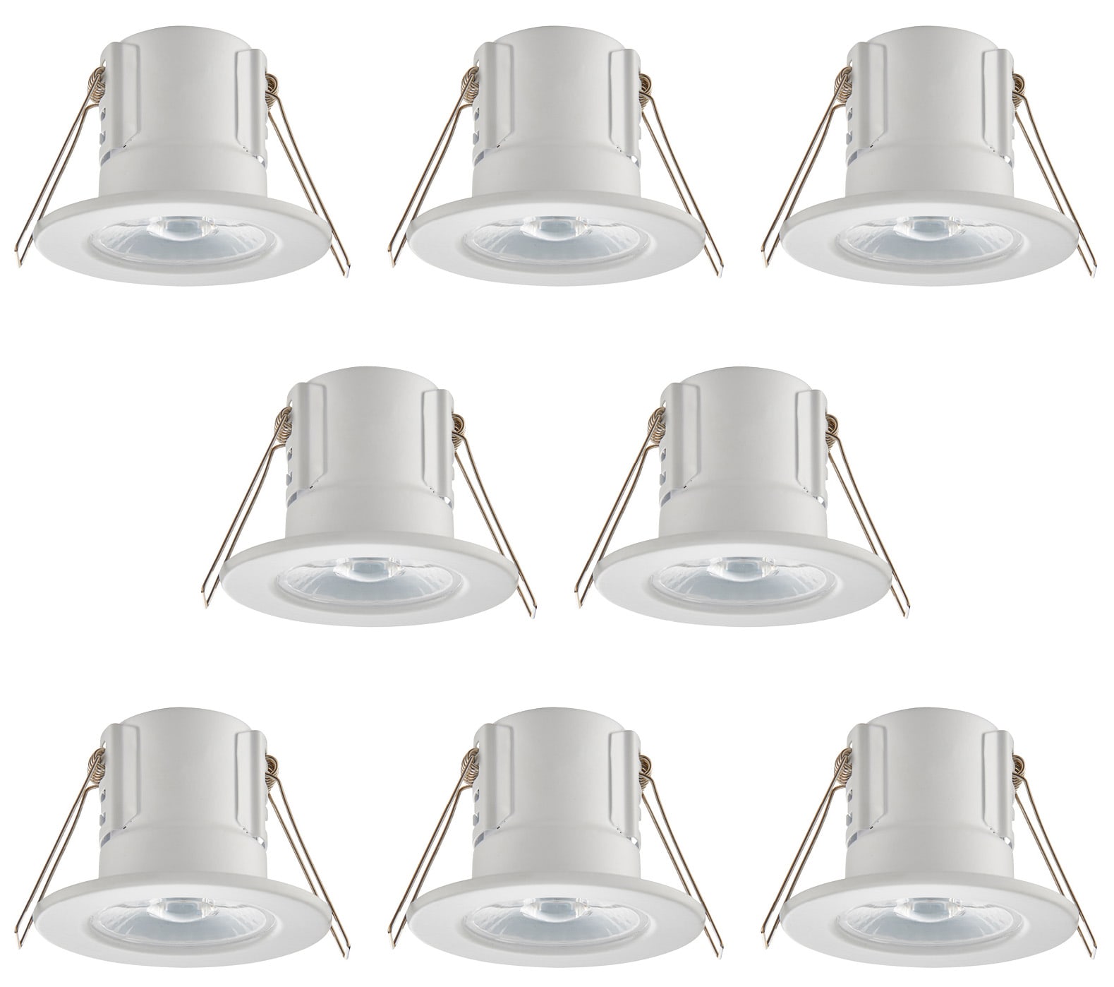 This convenient, installer-friendly 8-pack of Saxby Integrated LED Fire Rated IP65 Fixed Downlight has all the features required of an everyday downlight. Ideal for domestic use, the Saxby Integrated LED Light Fire Rated IP65 Fixed Downlight has all the features required of an everyday downlight; fire rated, IP65 and dimmable. Tool-less and quick to install due to the 4 way push fit screwless terminal block. The LED SMD module produces 500 lumens of cool white light from the anti-glare 60° lens. Slim profile with a matt white finish.