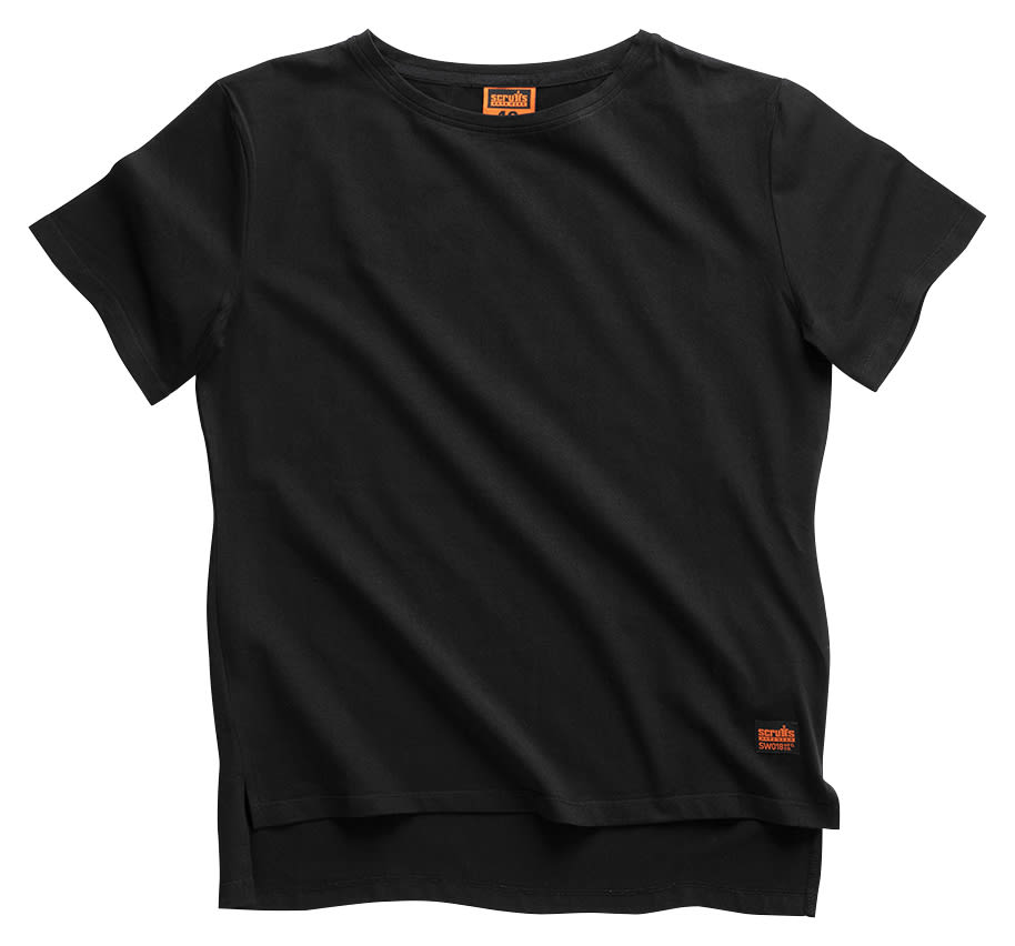 The Scruffs Women's Trade T-Shirt in black is a cotton fabric T-shirt with integrated anti-odour technology. Classic styling for a professional look and discreet branding with blank left chest, ideal for embroidered logos. Flexible stretch fabric for ease of movement. Longer length design to stop the T-shirt riding up when working.