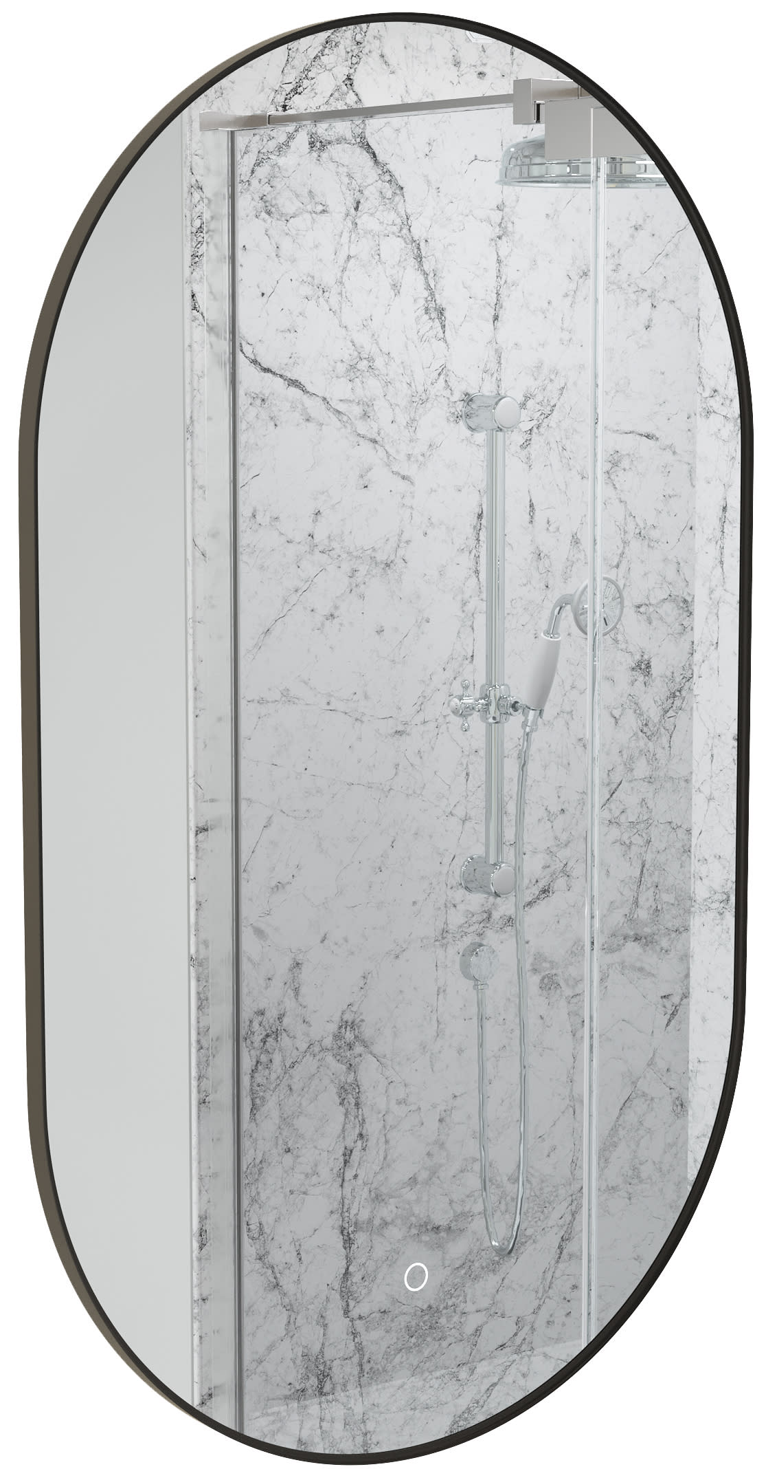 Contemporary curved pill-shape mirror with a black rim. CCT LED backlit border allows you to choose the perfect light setting, from warm to cool white, using the touch sensor. It also features an integrated demister pad for a steam-free reflection. Available in two sizes.