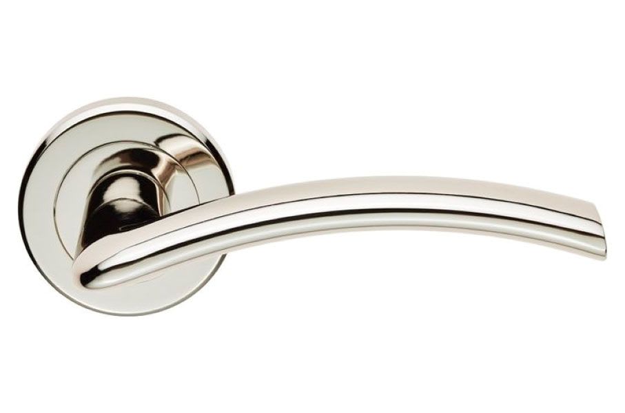 Lever on a chamfered edge concealed fix screw on round rose door handle. An arched flat style lever with a smooth curved top. A simple elegant designer door handle, sleek and curved lines offer both comfort and visual appeal. Part of the Serozzetta Residential range.