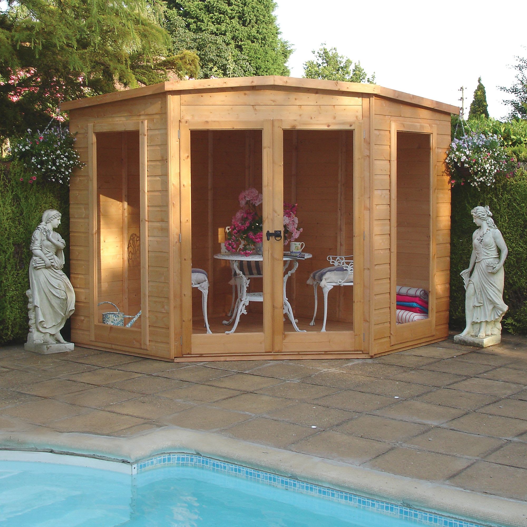 The Shire Barclay Double Door Pent Dip Treated Corner Summerhouse is ingeniously shaped to be primarily but not exclusively sited in a corner location providing an inspirational feature. Supplied in a dipped treated honey brown finish for extra durability and can still be painted in a colour of your choice. All fixings and instructions included.