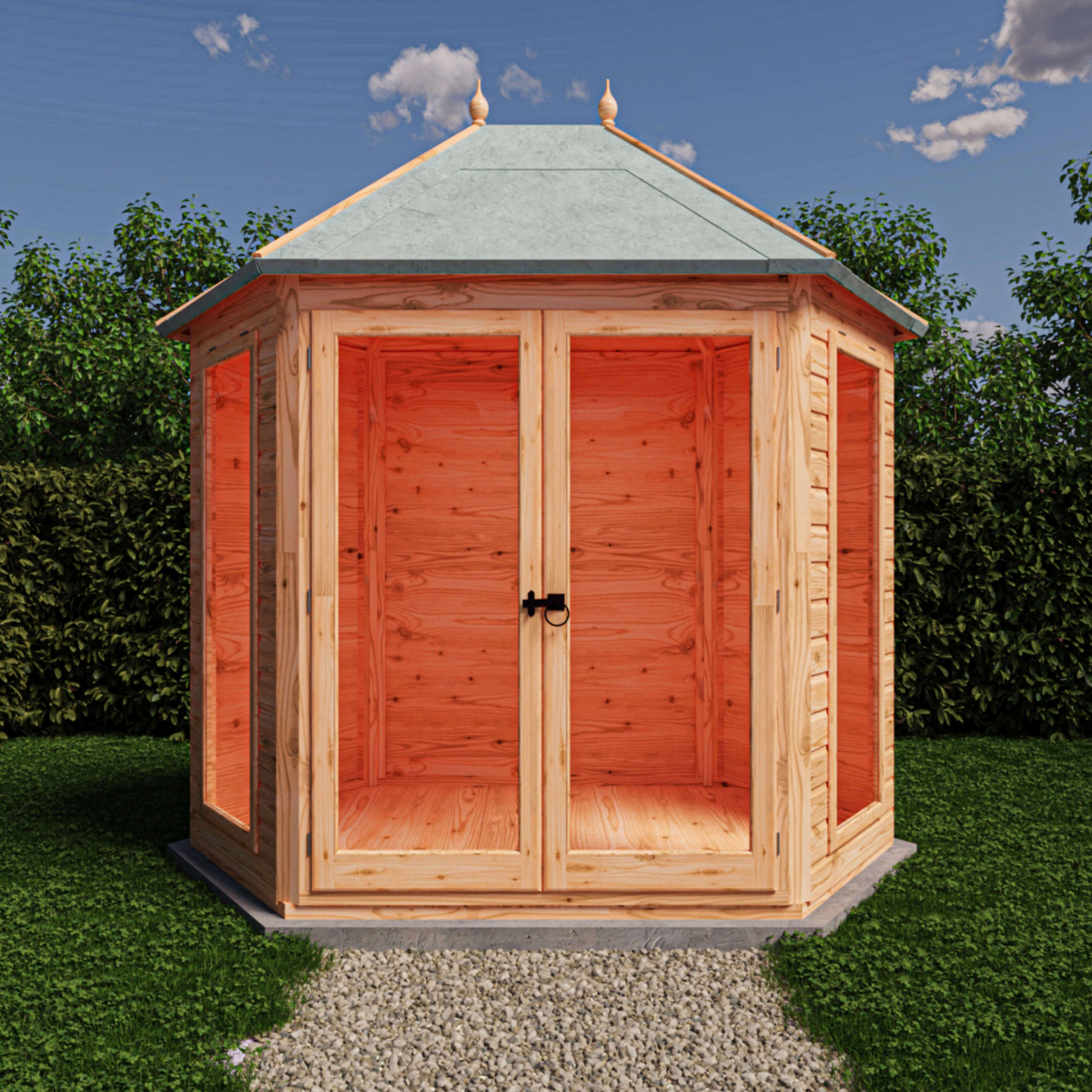 Elevate your outdoor space with the stunning Buttermere Hexagonal Summerhouse. At 8x7ft, this spacious garden retreat offers the perfect blend of style and functionality. The double doors welcome you into a bright and airy interior, thanks to two large opening windows with crystal-clear SAN glazing. Crafted for durability and beauty, it features premium tongue and groove shiplap walls, roof, and floor, supported by robust 34x34mm framing and traditional mortised and tenoned joinery. Whether you’re looking to entertain, relax, or create your dream garden getaway, the Windermere Summerhouse delivers elegance and quality that stand the test of time.