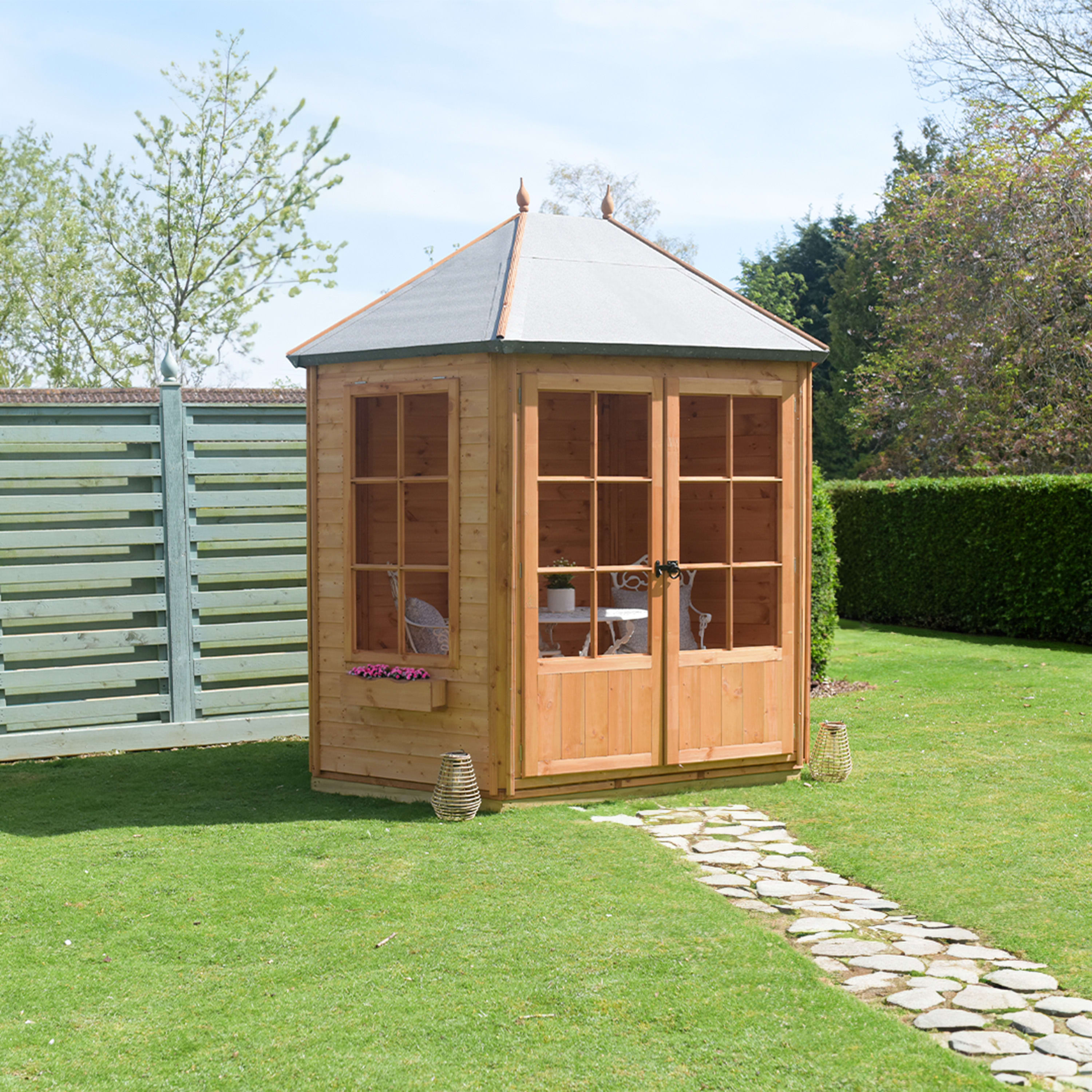 Elevate your outdoor space with the stunning Windermere Hexagonal Summerhouse. At 8x7ft, this spacious garden retreat offers the perfect blend of style and functionality. The double doors welcome you into a bright and airy interior, thanks to two large opening windows with crystal-clear SAN glazing. Crafted for durability and beauty, it features premium tongue and groove shiplap walls, roof, and floor, supported by robust 34x34mm framing and traditional mortised and tenoned joinery. Whether you’re looking to entertain, relax, or create your dream garden getaway, the Windermere Summerhouse delivers elegance and quality that stand the test of time.