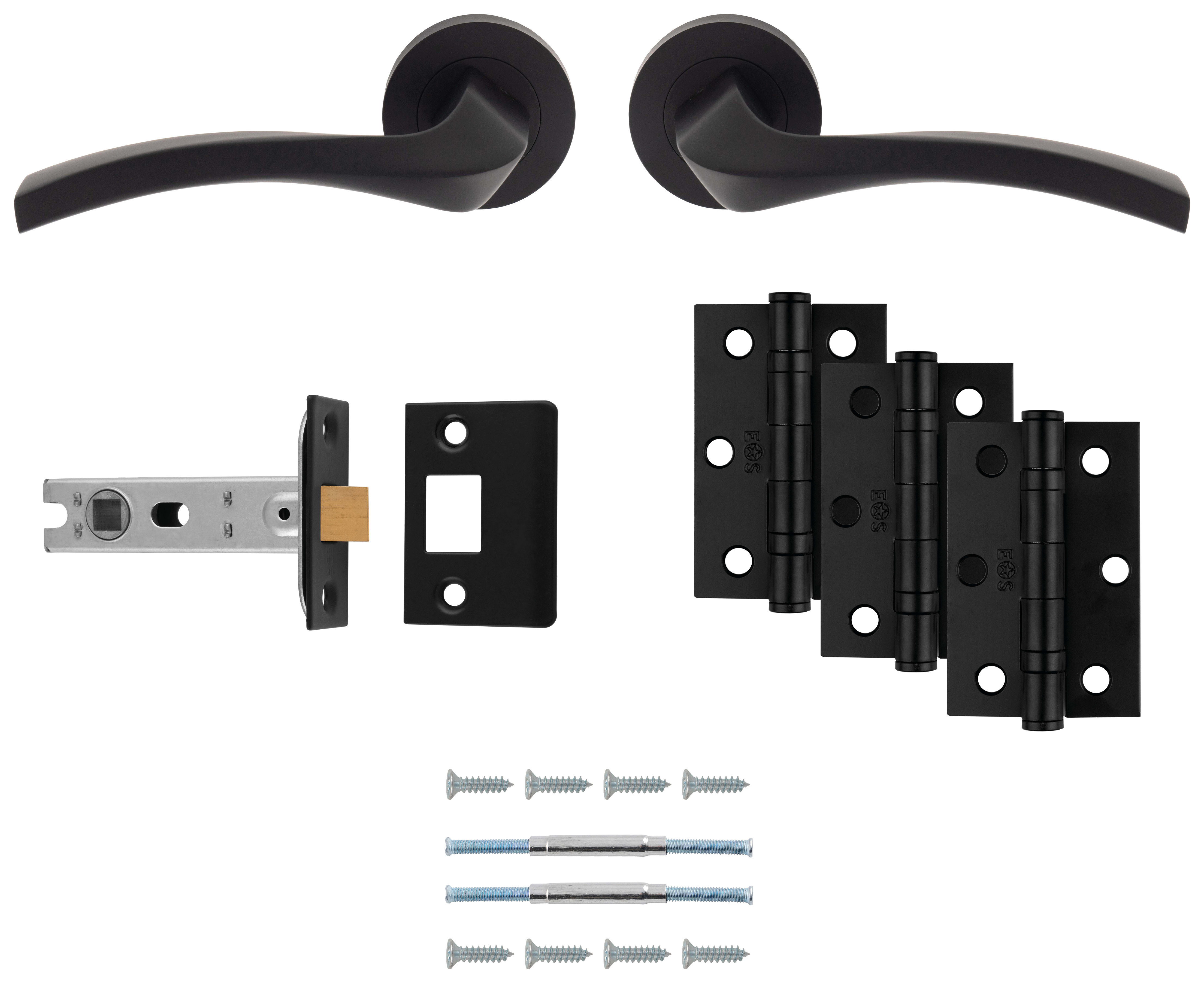 The Sines Ultimate Door Latch Kit includes a pair of designer door handles, a matching 3" tubular latch, and three coordinating 3 x 2" ball bearing hinges, all in a matt black finish. Perfect for doors ranging from 38-44mm thick, it's ideally suited for a home. With easy DIY installation, upgrading your doors has never been simpler.