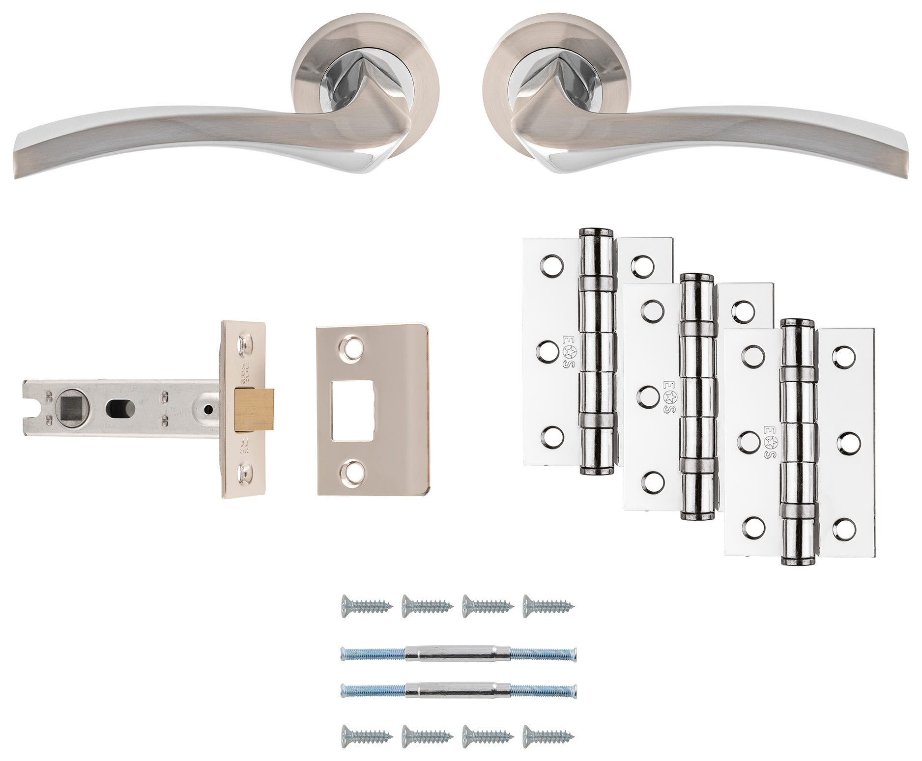 The Sines Ultimate Door Latch Kit includes a pair of designer door handles, a matching 3" tubular latch, and three coordinating 3 x 2" ball bearing hinges, all in a dual chrome finish. Perfect for doors ranging from 38-44mm thick, it's ideally suited for a home. With easy DIY installation, upgrading your doors has never been simpler.