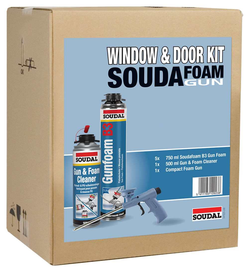 The Soudafoam Door & Window Kit includes PU expanding foam filler with window and door fillling formulation with high linear expansion. Easy to use, one component and rapid curing with excellent thermal and acoustic insulation properties. Primerless adhesion on most construction materials.
