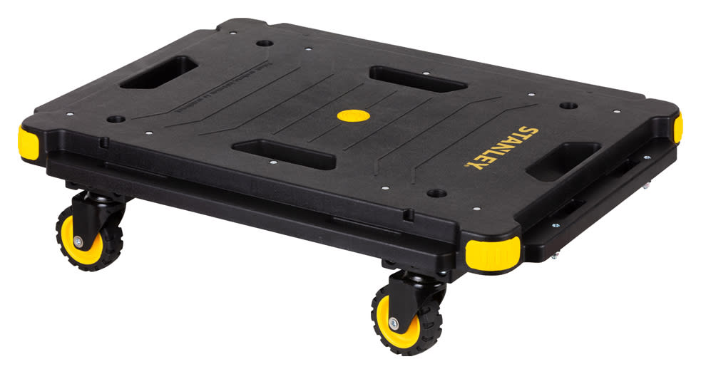 Stanley SXWT-PC531 Utility Flatform Dolly takes only seconds to open and close. All the major stress points are made of ultra-durable nylon; other plastic pieces are Polyproplene. It folds flat for easy storage. Specifications: Max. Load: 137kg. Base Plate: 60 x 45cm. Overall Size: Folded 600 x 450 x 77mm, Unfolded 600 x 450 x 167mm. Wheel Diameter: 75mm. Weight: 5kg.