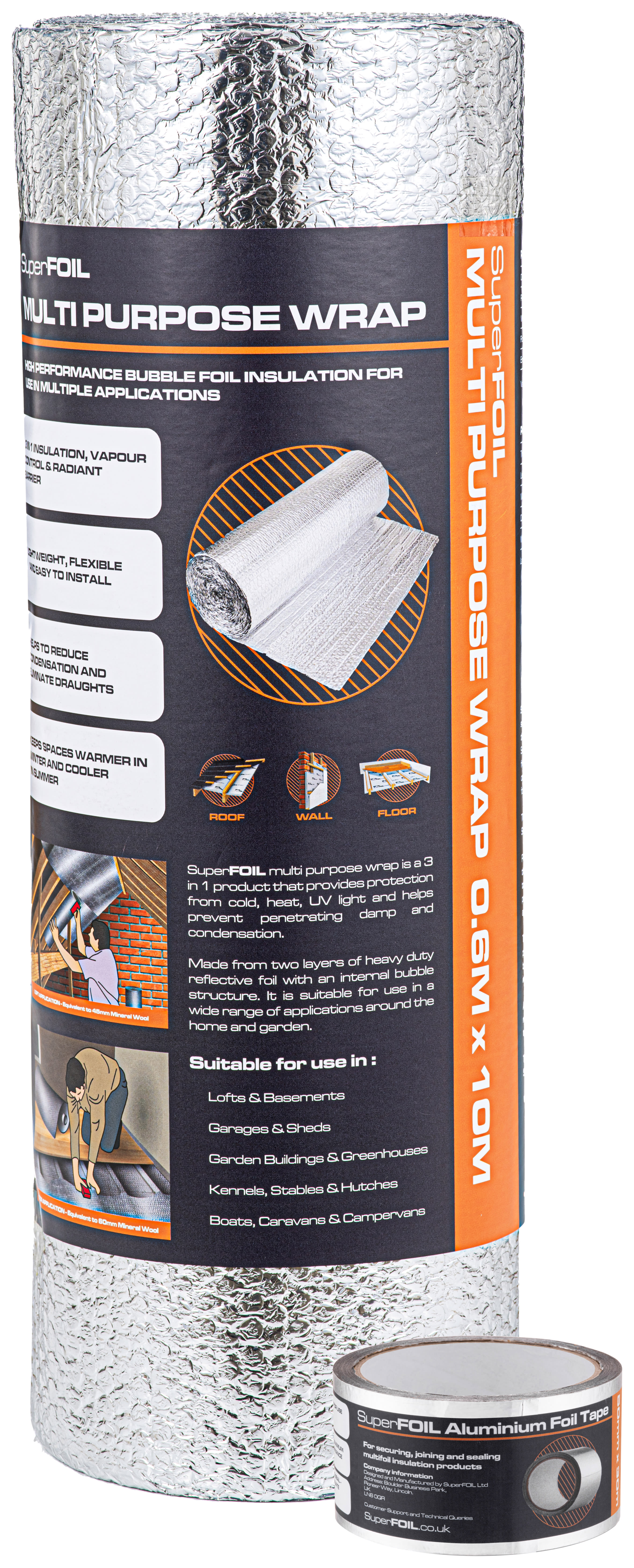 The SuperFOIL Multi-Purpose Insulation and Foil Tape Set provides protection from cold, heat, UV light and helps prevent penetrating damp and condensation. Made from two layers of heavy duty reflective foil with an internal bubble structure. It is suitable for use in a wide range of applications around the home and garden. Lightweight and flexible SuperFOIL Insulation is very easy to install with no harmful particles or fibres. Ideal for use in: lofts and basements, garages and sheds, garden buildings and greenhouses, kennels, stables and hutches, boats, caravans and campervans.