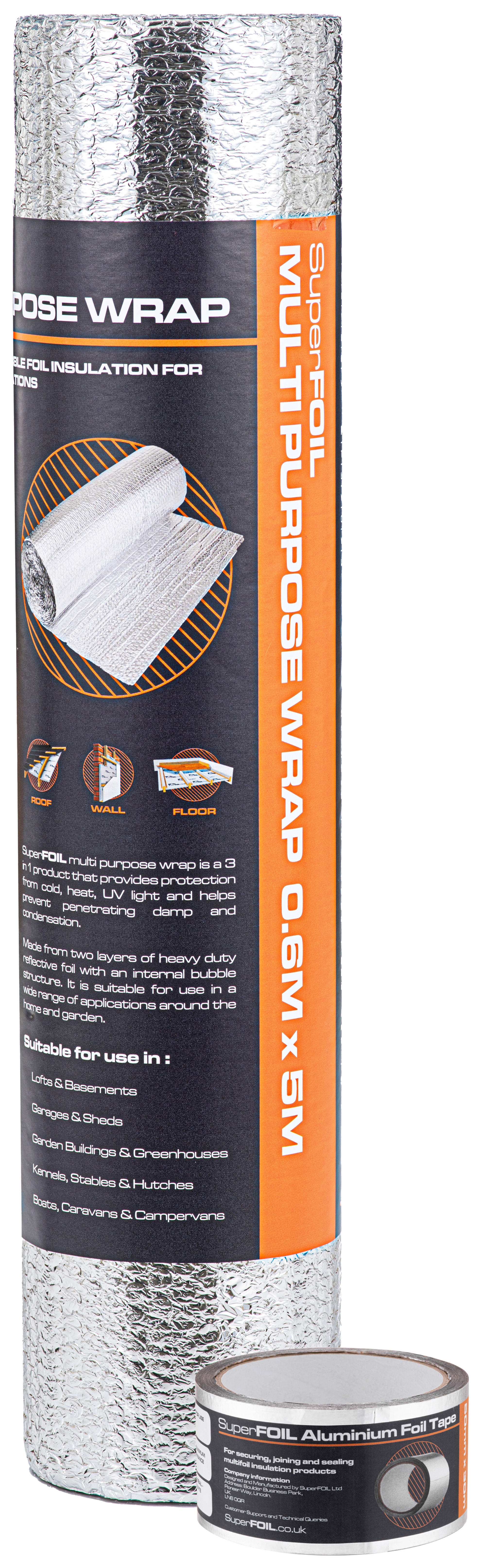 The SuperFOIL Multi-Purpose Insulation and Foil Tape Set provides protection from cold, heat, UV light and helps prevent penetrating damp and condensation. Made from two layers of heavy duty reflective foil with an internal bubble structure. It is suitable for use in a wide range of applications around the home and garden. Lightweight and flexible SuperFOIL Insulation is very easy to install with no harmful particles or fibres. Ideal for use in: lofts and basements, garages and sheds, garden buildings and greenhouses, kennels, stables and hutches, boats, caravans and campervans.