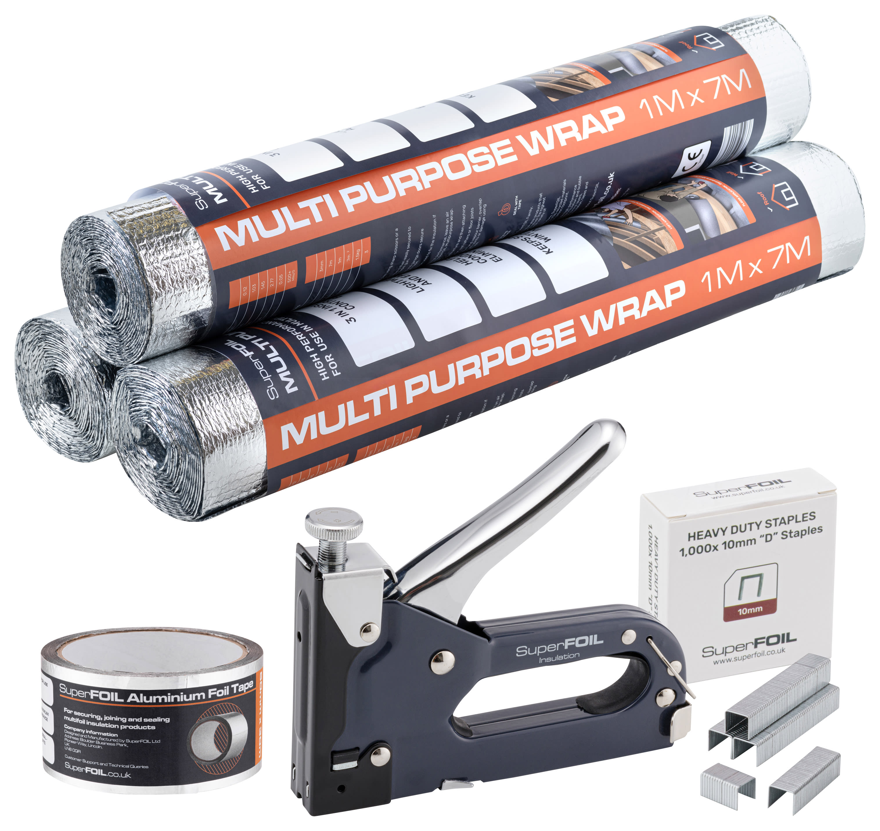 - Also includes heavy duty SuperFOIL staple gun with 1000 heavy duty 10mm staples and 50mm x 30m SuperFOIL aluminium foil tape