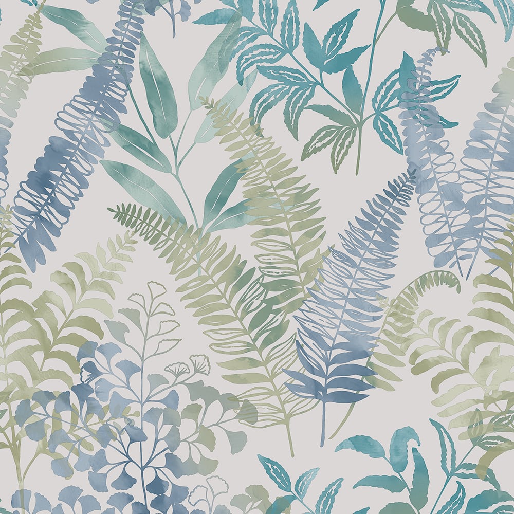 Exotic tropical leaf overlay print in soft blue and neutral tones. Versatile and durable, this product is perfect for high-traffic areas such as halls, stairs, and landings. Easy to hang and remove thanks to special non-woven backing paper, you simply paste the wall and hang direct from the roll. It's also fully strippable, so removing the product from the wall is done in minutes!