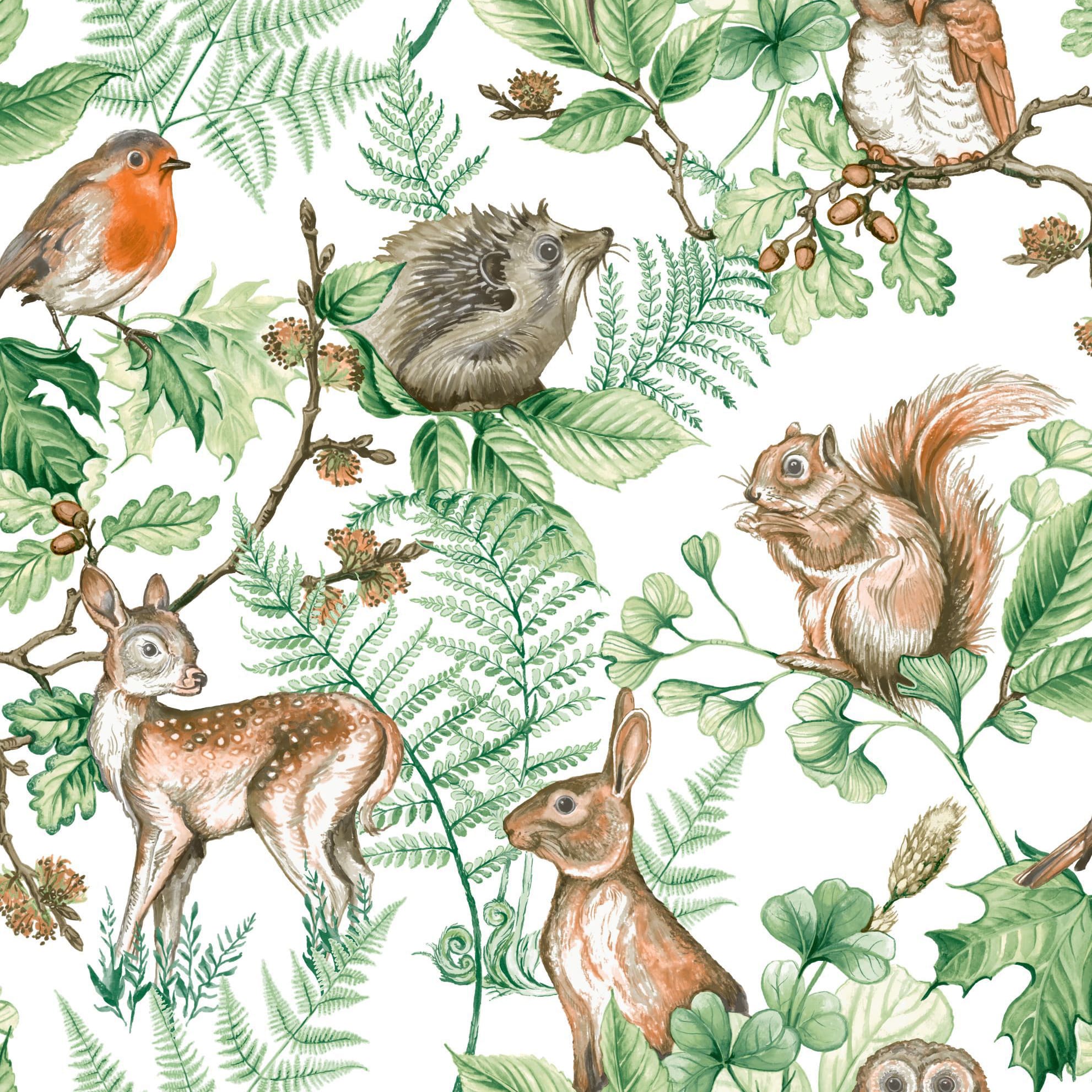 Our Woodland Animals wallpaper is one of our firm favourites for the kids room! Featuring whimsical and charming hand painted bunnies, deer, birds, hedgehogs and friends woven amongst an array of greenery that you would find on a forest floor. Also available in a contemporary navy colourway.